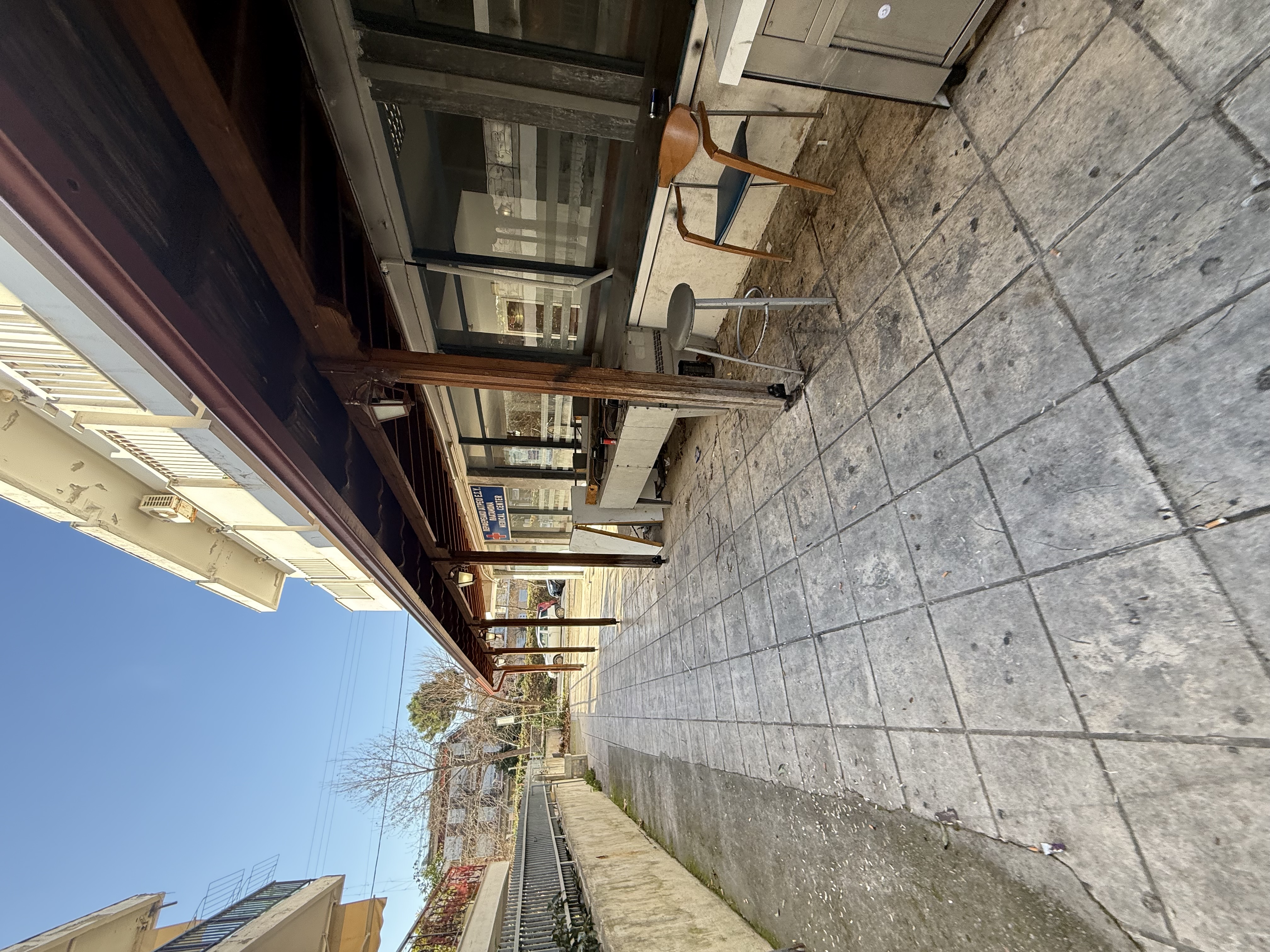 exterior shot make the design on the original photo and dont change the form of the original place change the floor with tile grey 60x60 put this green bench in 3 points make the wood with plaster put stiche on the vitrine and put some lights on the wall