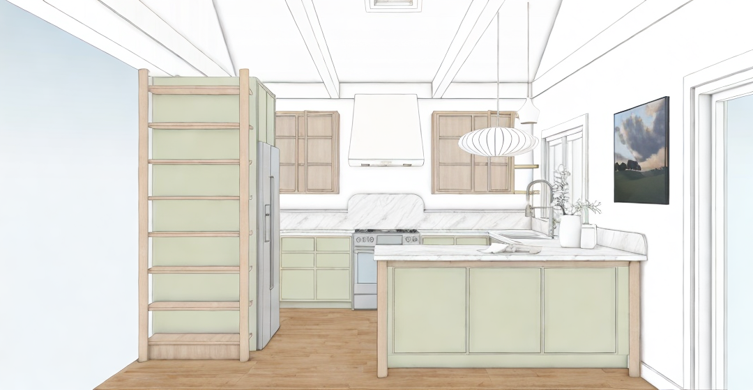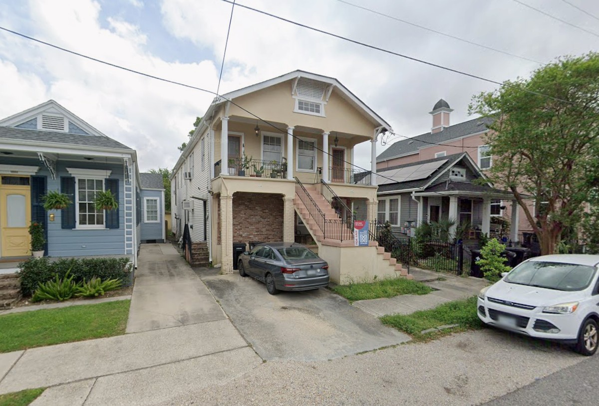 mediterranean revival exterior shot only the middle building is re painted medium sage green stairs and doorways are peach color the sidewalk and driveways remain as they are a flowering vine grows up the staircase railing the grass area below the stairs is covered in lilies and irises of different colors architecture