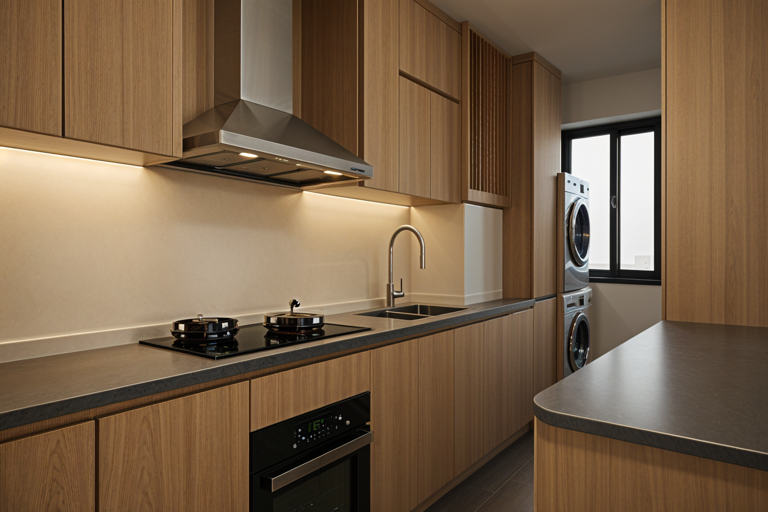 create a serene modern bathroom with a natural stone aesthetic complemented by a light cream floor incorporate a double sink with a sleek off white countertop and a dark wood cabinet below design a freestanding matte gray bathtub surrounded by smooth river stones adding a natural element include a large leafy green plant beside the tub for a fresh look position a horizontal wooden shelf with candle holders above the bathtub and a window with sheer gray curtains allowing soft natural light use black fixtures for a modern contrast and incorporate warm ambient lighting to enhance the cozy tranquil atmosphere