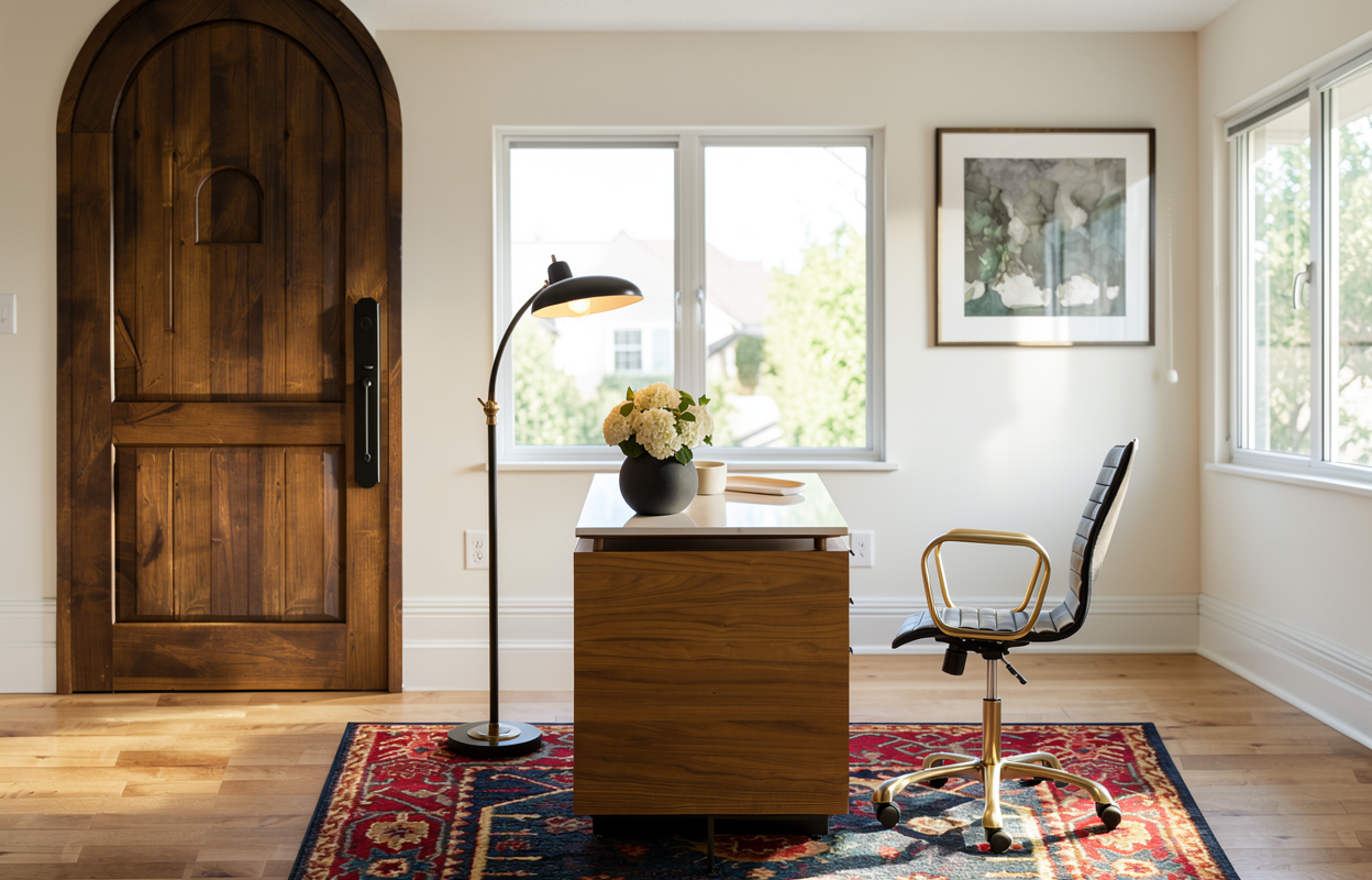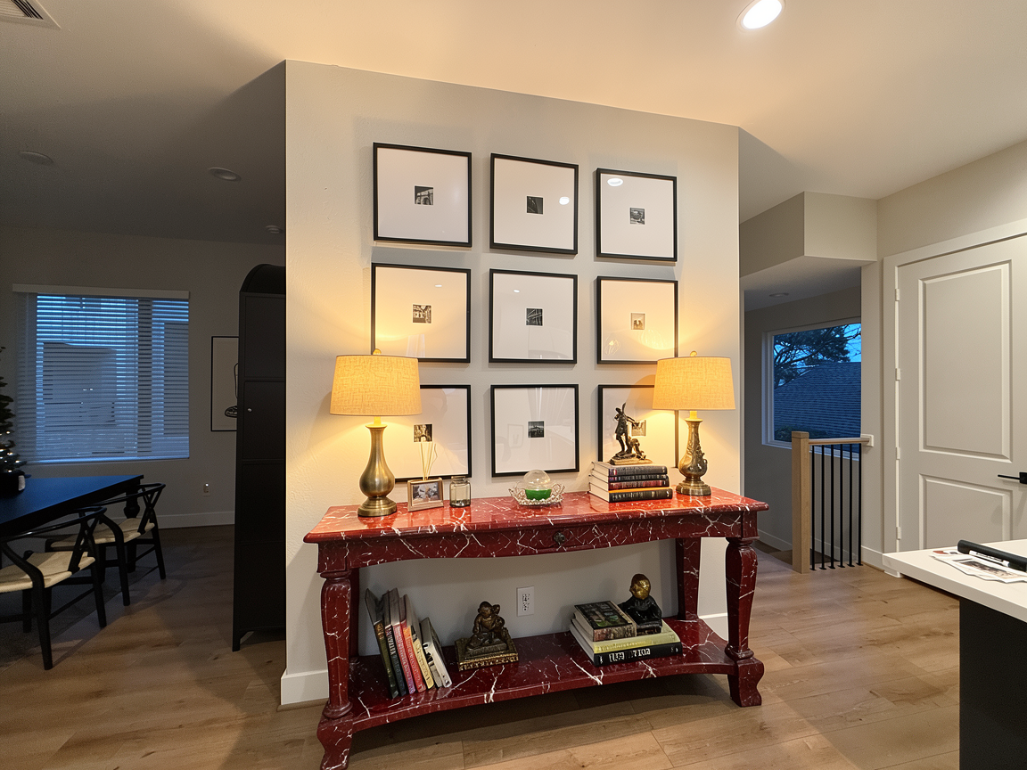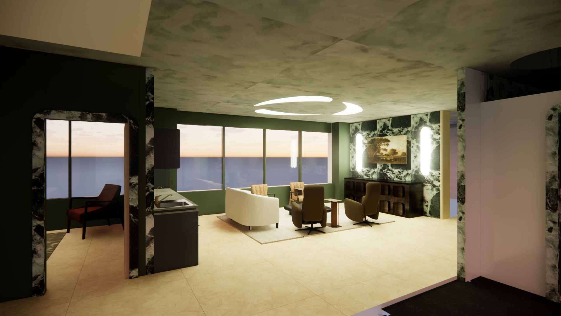 sure here s a prompt for rendering the image render a modern interior living space with a serene and inviting atmosphere the room features large panoramic windows showcasing a sunset view over the new york city skyline walls are painted soft olive green accented with dark marble borders the ceiling has a light green stone texture and features leaf shaped circular ambient lighting coves the floor is covered with flower pattern blonde wood a cozy white sofa and two plush green armchairs surround a dark metal coffee table with elegant design soft lighting enhances a classic landscape painting on the wall surrounded by marble a dark metal cabinet complements the room adding warmth the overall ambiance is peaceful elegant and sophisticated