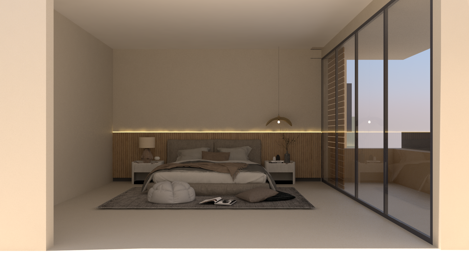 modernist interior shot modern minimalist bedroom with a cozy calming atmosphere soft beige walls and ceiling illuminated by delicate warm led strip lights above a wooden headboard the bed is adorned with plush gray bedding and earth toned throw pillows elegantly arranged beside the bed white side tables host simple decor including a geometric lamp on one and a slender vase on the other a textured gray rug covers the light beige floor adding depth a large glass door with a subtle reflection showcases a serene sunset sky in gradients of soft blue and pink enhancing the tranquil mood architecture