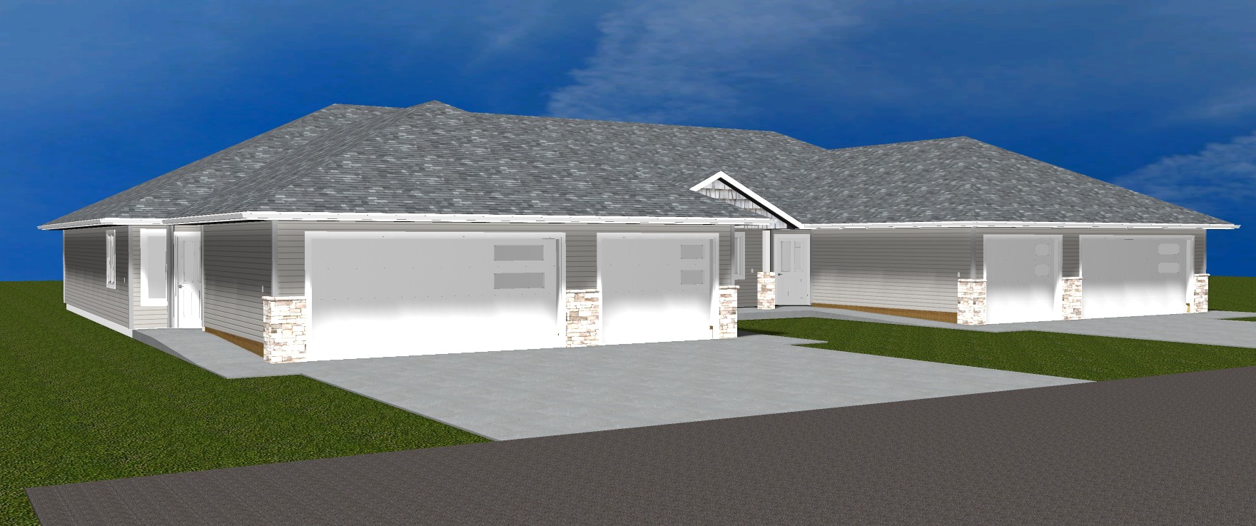 add minimal landscaping and background trees in an evening setting