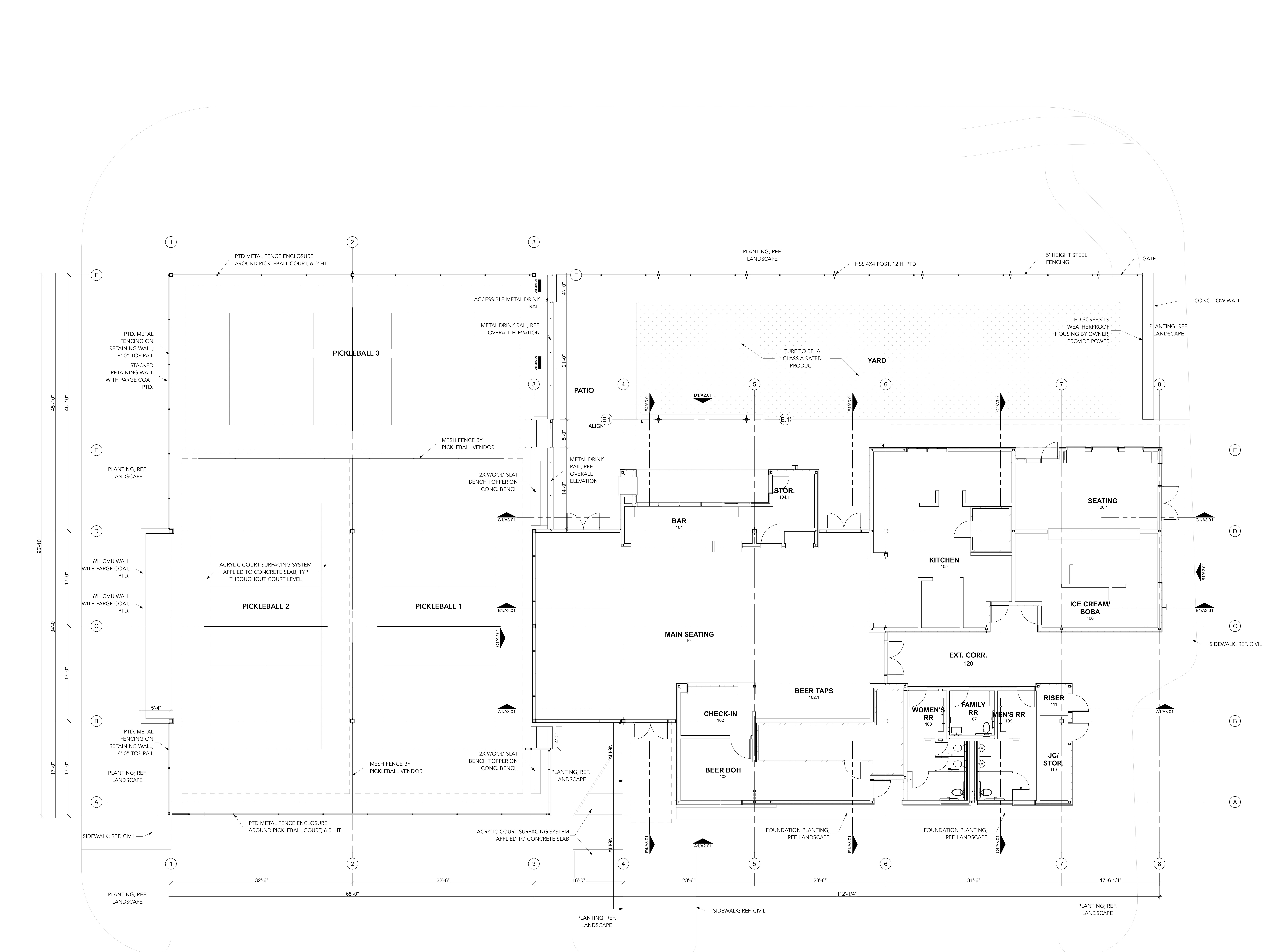 can you take this floor plan and give me a diagram example of how we can create a guest experience flow chart expressing the customer experience from the moment they enter the doors and throughout the space can you create a flow diagram for the target customer profile for a guest that is coming to enjoy casual dining drinks and a casual game of pickleball use this floor plan and show me how the guest would interact with the space possible furniture layouts etc