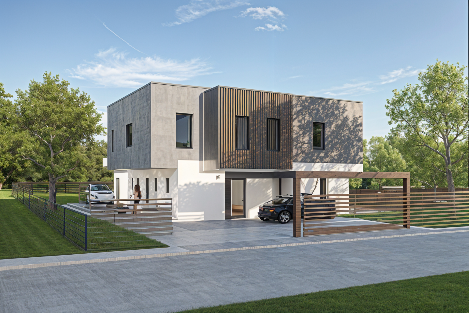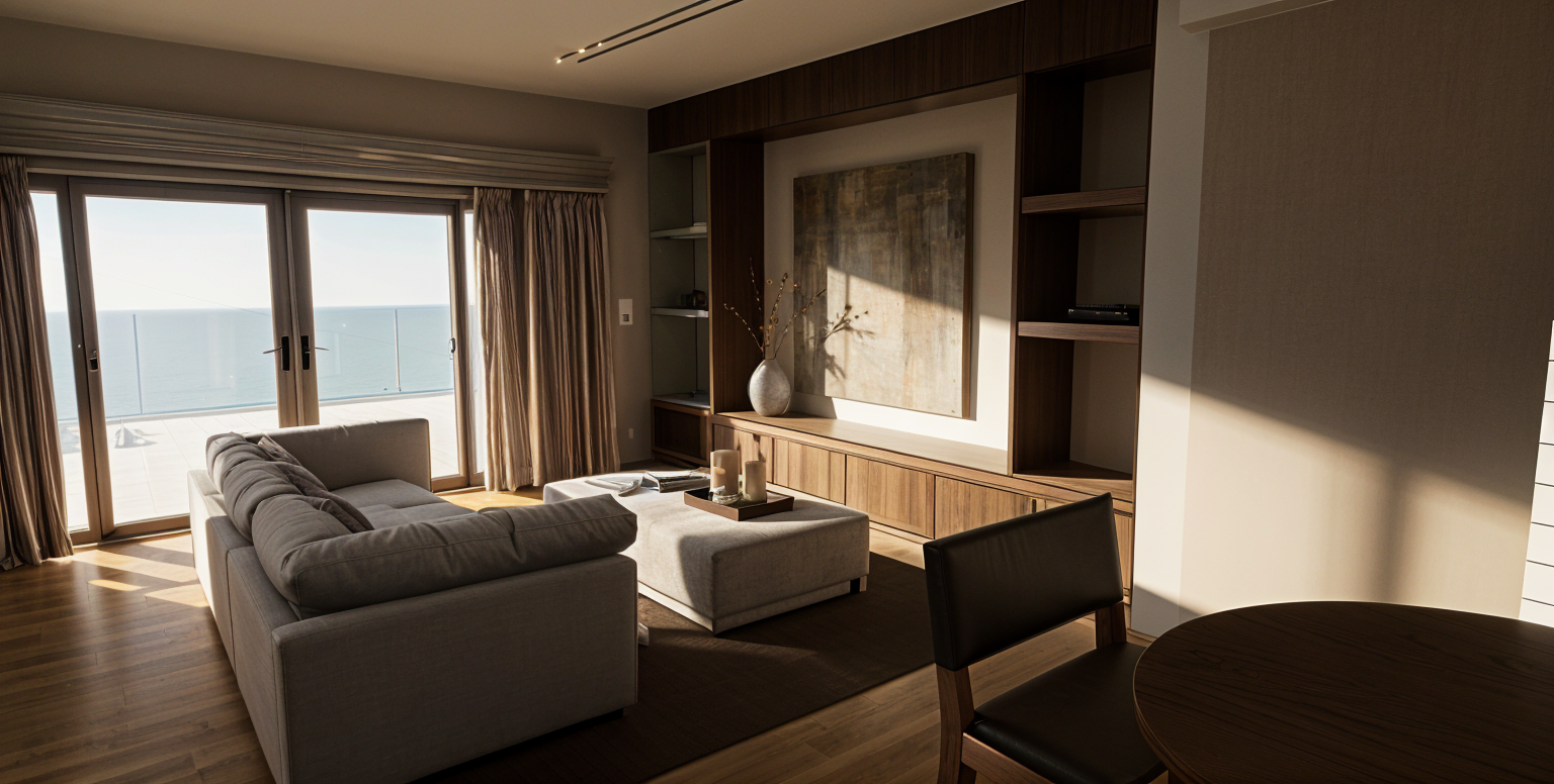 realistic daylight cozy house with realistic textures the roof is off white with lighting on the celling the celling bright there is light on the false celling bright the outside view are apartments in a island