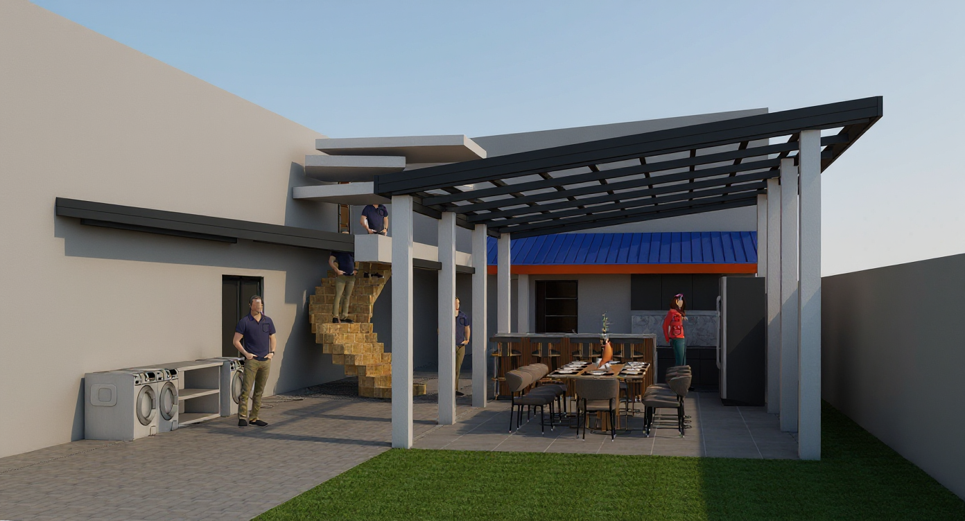 white rough cement plaster walls black railings black deck black roof california landscape and oak trees afternoon setting