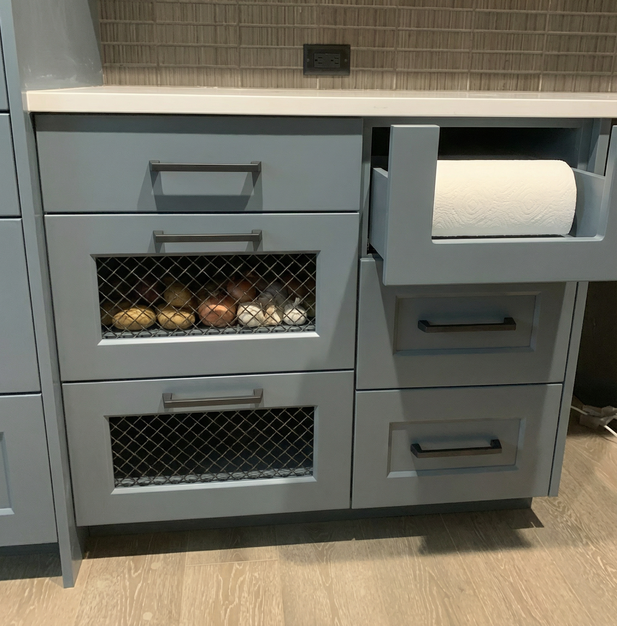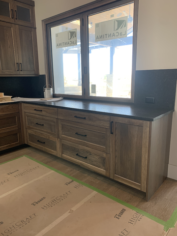do not change the cabinets in any way preserve the exact cabinet colors materials finishes dimensions door and drawer styles hardware spacing alignment and all geometry exactly as shown do not alter the countertop shape backsplash appliances flooring lighting fixtures or wall structure only remove the construction materials clutter and mess from the scene clean the room and make it look finished and staged add a few simple tasteful home accessories appropriate for the style of the space but do not add or remove any furniture windows or architectural elements maintain the original lighting direction and realism enhance clarity and polish the photo while keeping the cabinetry and room design completely unchanged do not alter the lighting to keep the cabinet colors as they are in the image remove the paper on the floor add a simple view out the window restage teh countertop for a beautiful kitchen
