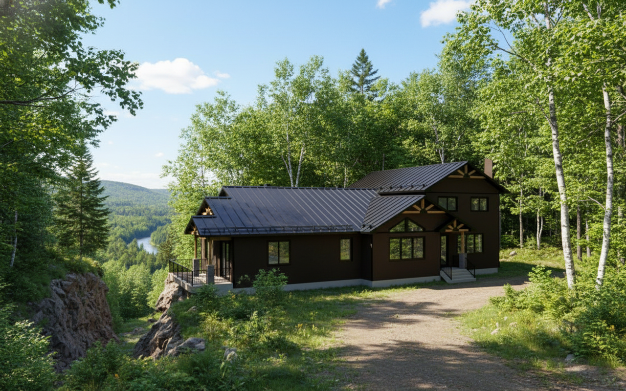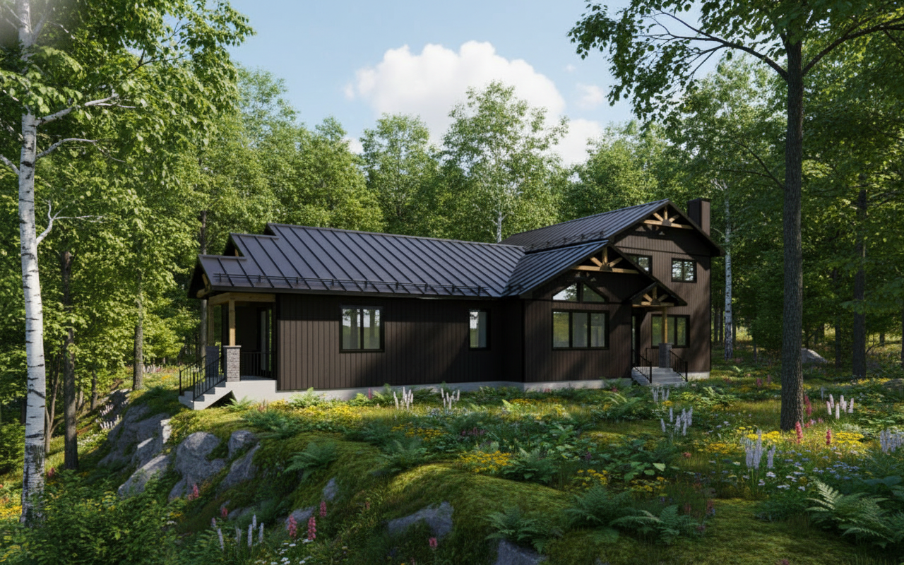 make this image have white oak siding going horizontal black metal corrugated panels for the rook make it de on a mountian with brown and green cloors add clouds to the sky