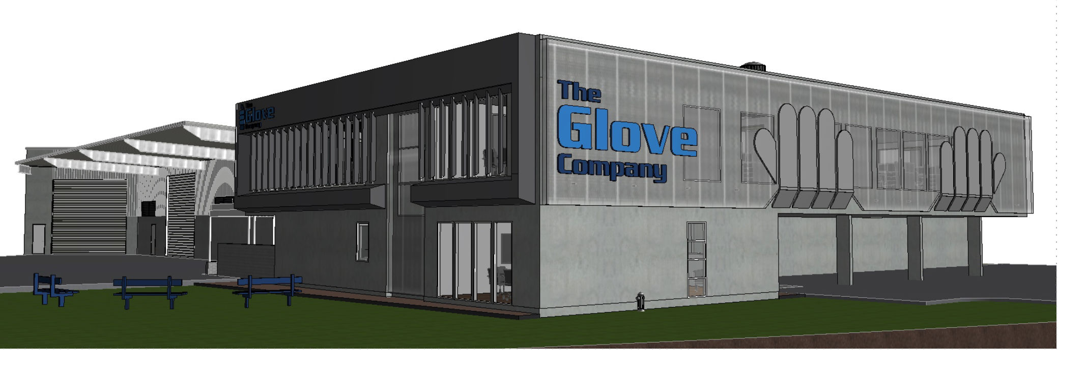 transform this archicad screenshot showing a 3d image of a proposed warehouse building it is a glove company with a mesh style facade