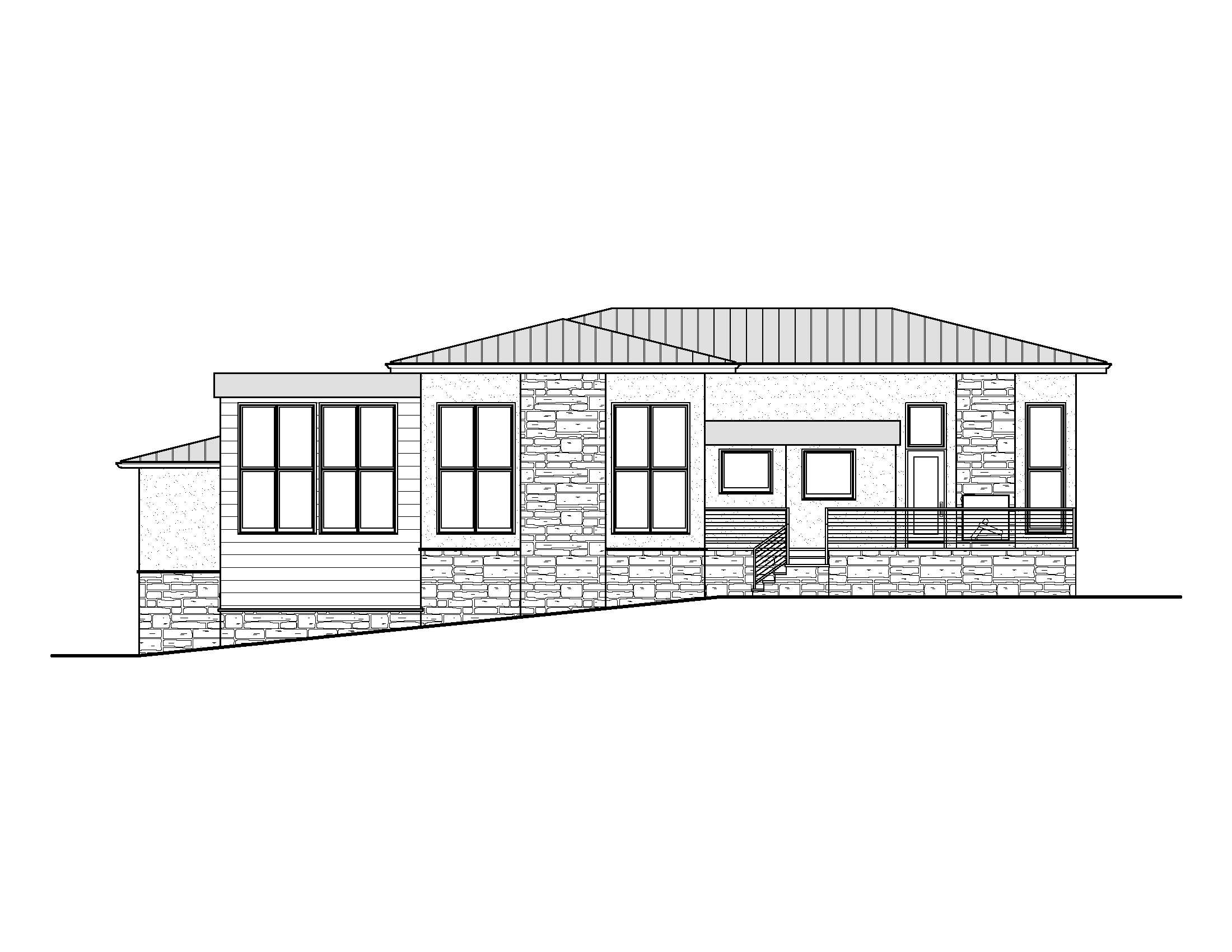 use the same colors and everything as the last render for this side elevation as well please render this residence as a modern home situated among large mature trees and small contemporary planting the house is mainly a light colored off white stucco with a similar light colored stone as well as horizontal wood panels add inground pool on the left side