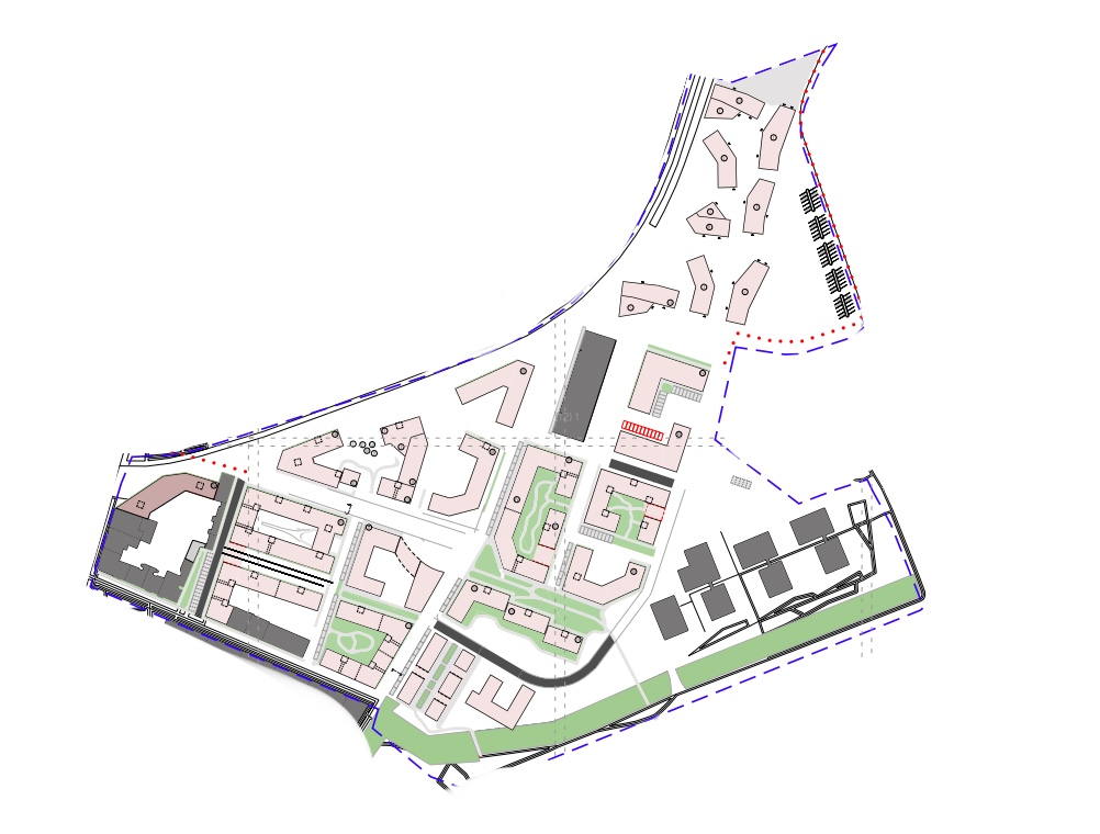 create a detailed urban masterplan for the given site boundary design a coherent and functional layout of roads pedestrian paths bicycle routes parking areas and green spaces within the area the road network should be hierarchical main access roads local streets service roads with safe and legible pedestrian and cycling connections parking areas should be integrated into the urban fabric partially hidden by greenery avoiding large asphalt surfaces plan a well balanced green system including public parks pocket parks tree lined streets green buffers and semi natural areas green spaces should improve walkability microclimate and social interaction and connect key parts of the site the composition should follow human scale urban design principles with clear spatial structure readable public spaces and smooth transitions between built and open areas style urban design competition board clean legible top down or axonometric view high resolution professional architectural visualization muted natural colors clear linework soft shadows