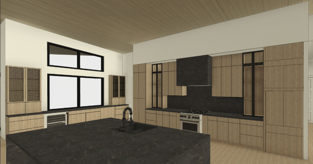 realistic architectural interior rendering in natural daylight preserve all existing architectural elements exactly as shown do not add remove or reposition any structural components cabinetry layout appliances or fixtures unless explicitly stated below countertops two countertop sections only one to the left of the oven and one on the island the hood is also in the same material no other surfaces added material charcoal marble with very fine thin naturally blending veins soft and organic not bold or graphic no thick or marker like veining cabinetry all light wood cabinetry and flooring shown should render as light neutral oak neutral not warm natural grain not yellow or orange all exterior facing black cabinets must render in matte black no sheen or gloss left window cabinets mesh door detail the tall flanking cabinets on either side of the windows on the left wall must have door fronts featuring a woven metal mesh inset panel a fine tight diamond pattern wire mesh with a dark bronze aged brass tone set within a flat oak frame the mesh has visible depth and texture it is not a printed pattern or perforated sheet but a three dimensional interlocked woven wire hardware no small round brass knobs the cabinet body frame color and proportions must remain exactly as shown in the base rendering only the door insert material changes to this mesh detail styling details interior of left side cabinets add stacked plates and minimal decorative objects visible through the mesh island surface one small potted plant and one fruit bowl placed naturally no pendant lighting added atmosphere realistic natural daylight windows must show lush green trees and a clear blue sky no artificial lighting introduced do not add any furniture fixtures d cor or architectural elements beyond what is described above key addition explained the phrase three dimensional interlocked woven wire not a printed pattern or perforated sheet one change only the tall cabinet doors on the far left wall must be updated to feature a tight dense woven metal mesh insert the pattern should read like an interlocked diagonal weave similar in density to chain link or barbed wire mesh where individual wire crossings are clearly visible and tightly packed with very little negative space between them the mesh should appear dark bronze to near black in tone receding slightly behind the oak frame it is a three dimensional woven material with visible wire depth not a screen not a perforated sheet not an open grid the oak cabinet frame proportions brass hardware and all surrounding elements remain exactly as shown do not alter any other element in the image
