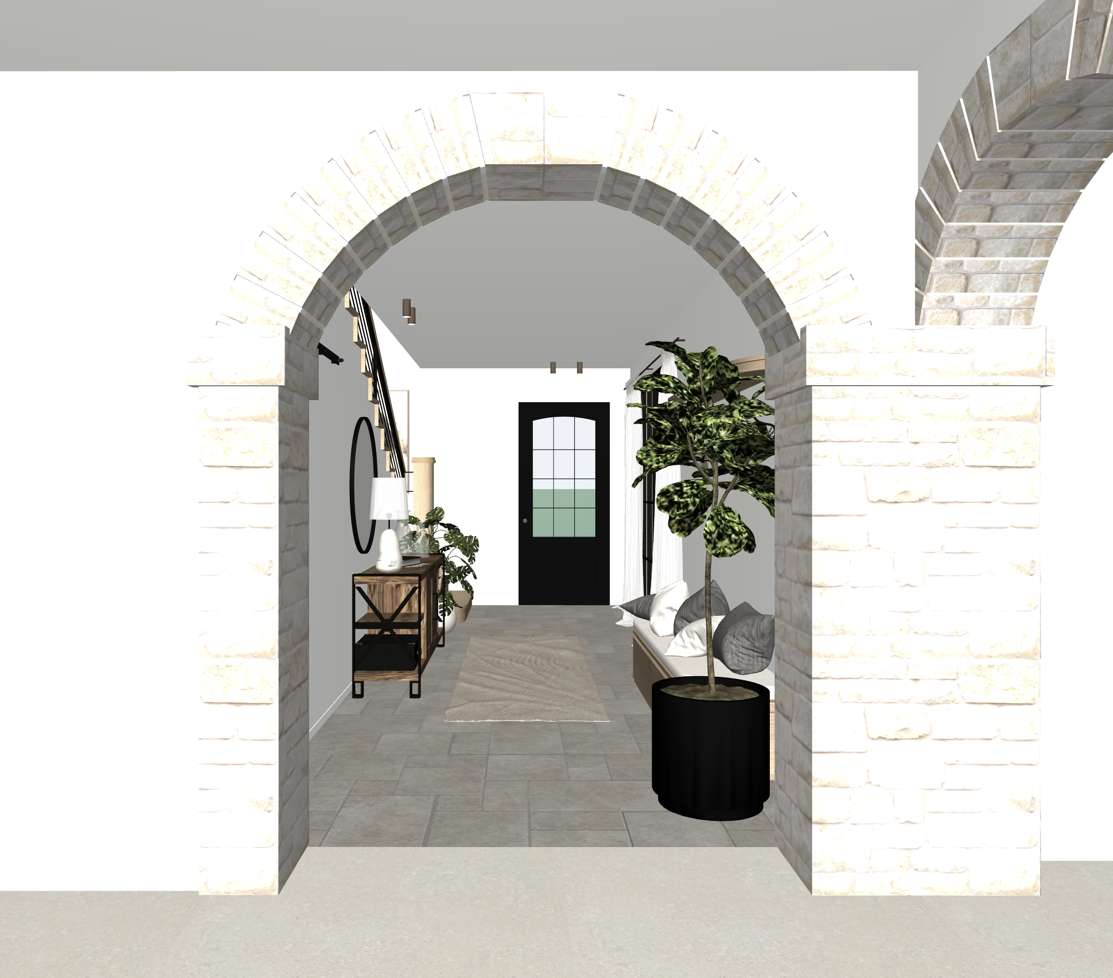 ingresso abitazione sopra alla consolle c uno specchio tondo la base della lampada da tavolo in pietra chiara non ci sono strip led i faretti cilindrici a soffitto sono accesi la pavimentazione prima dell arco in pietra chiara liscia dalla finestra entra della luce naturale fuori metti degli alberi con un panorama di campagna le arcate sono in pietra