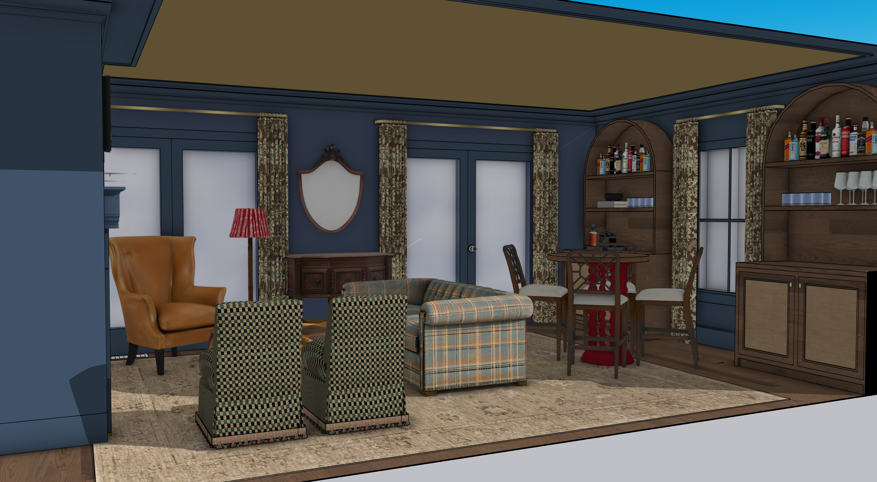 the uploaded image is a finished sketchup interior scene with final materials already applied preserve the camera angle room layout and furniture placement exactly as shown all materials must remain unchanged including the fabric the upholstery the rug the fireplace surround the mantel and the wood flooring do not reinterpret fabrics colors or textures enhance the image by adding realistic lighting shadows and material depth only to create a photorealistic architectural rendering strict preservation keep all fabrics patterns colors and materials exactly as shown material fidelity required