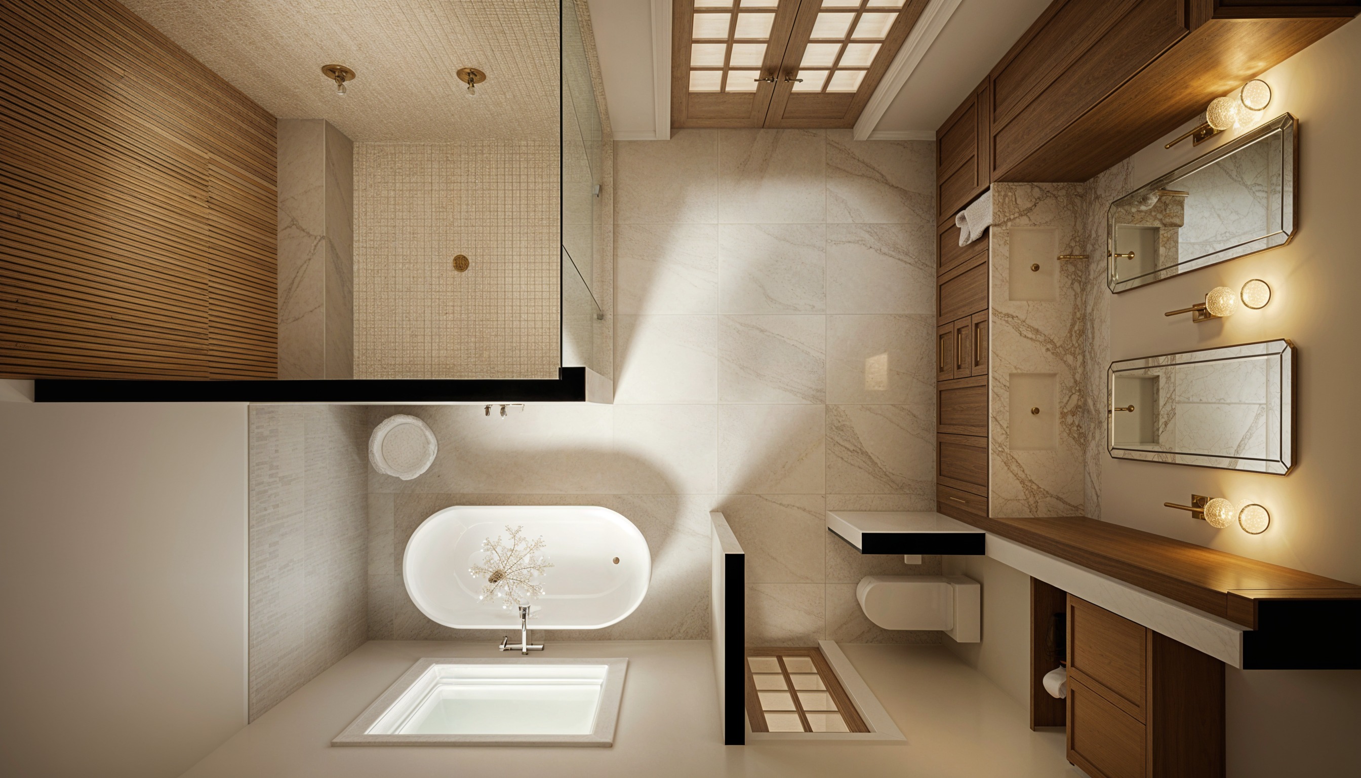 preserve the exact layout camera angle and placement of all elements do not move or redesign anything replace glass in french doors with wood panels keep the chandelier over the tub