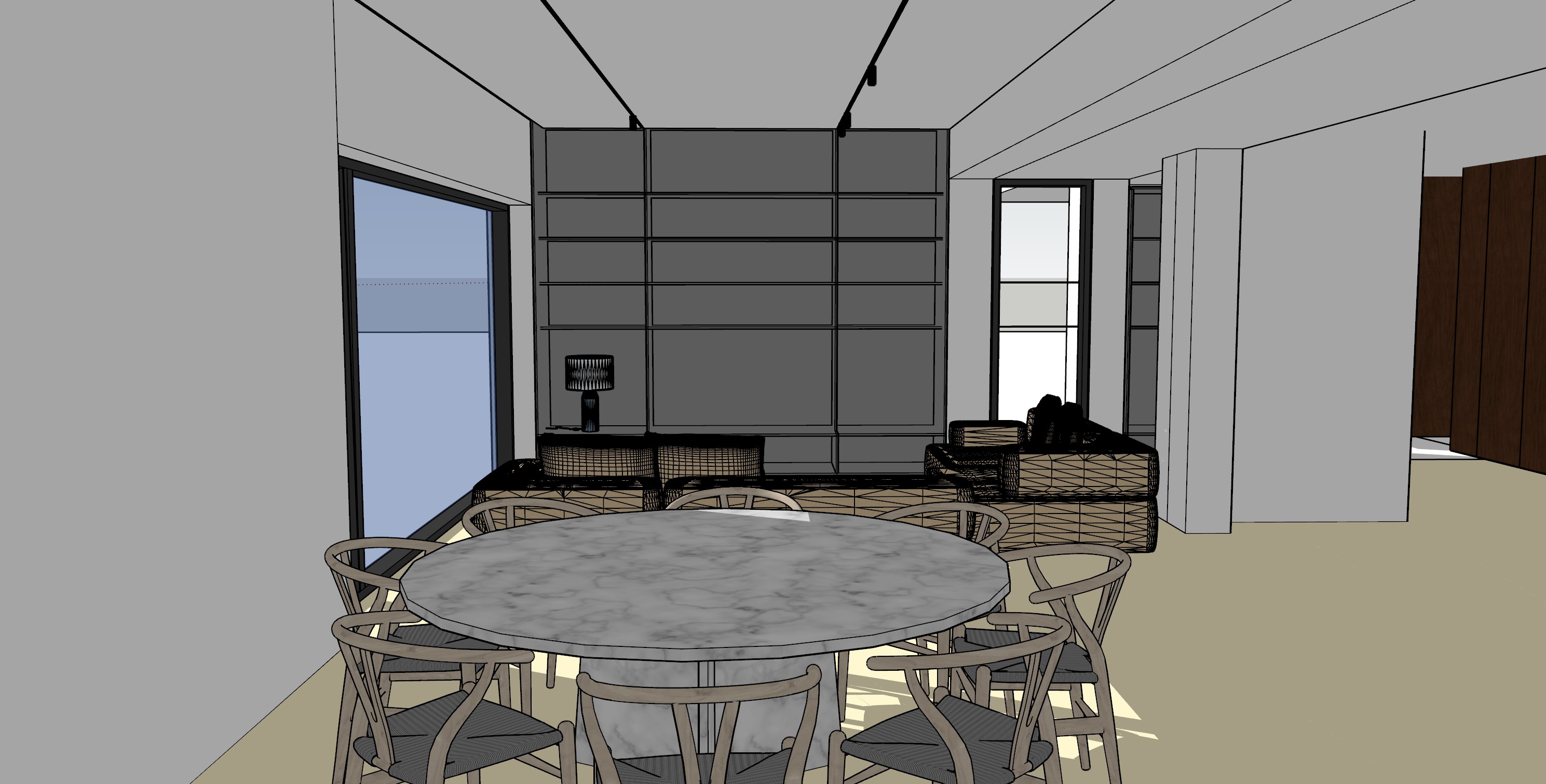realistic rendering of a livingroom and dining area light white oak timber flooring add bokks and art in the bookshelf add curtains along the left wall add hanging klint lamp over the table