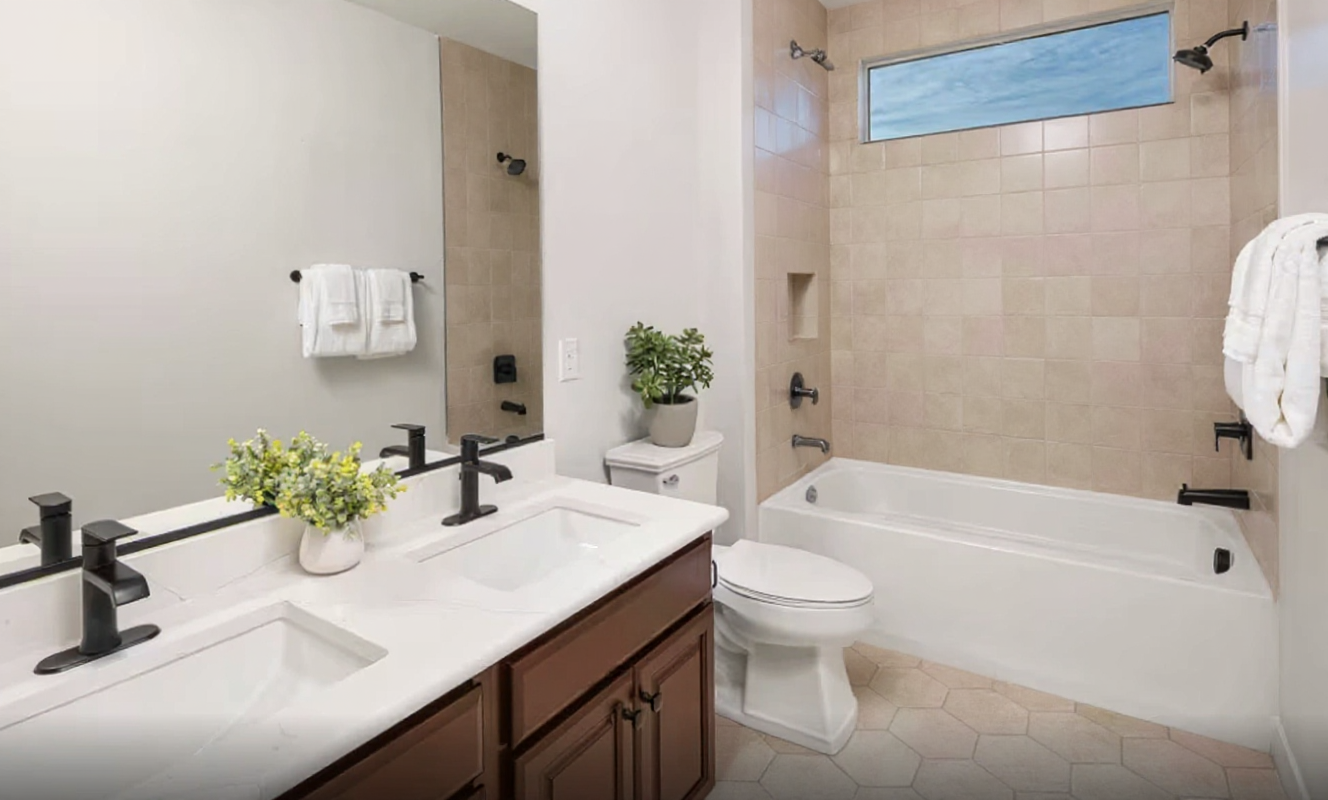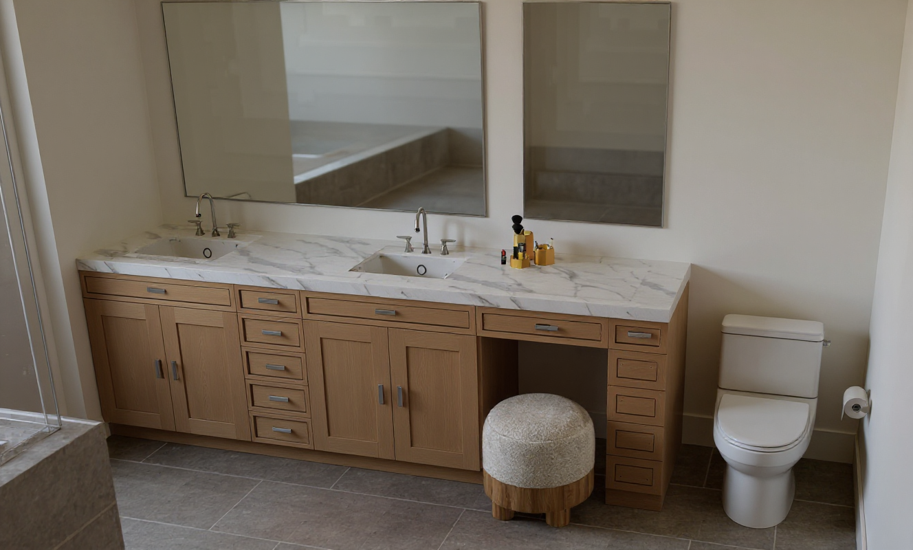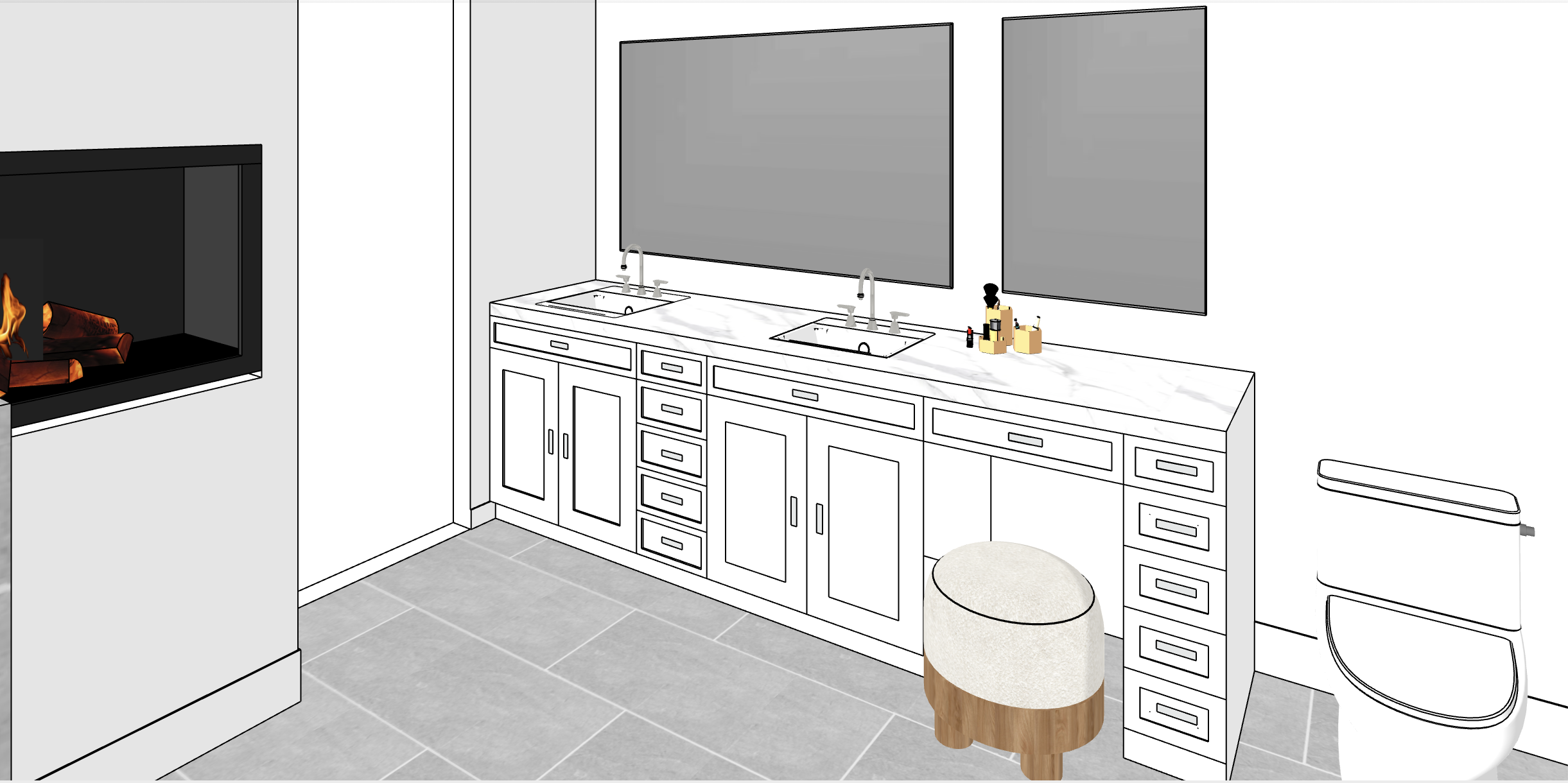 light grey floor tile and white shaker vanity lighted mirrors architecture