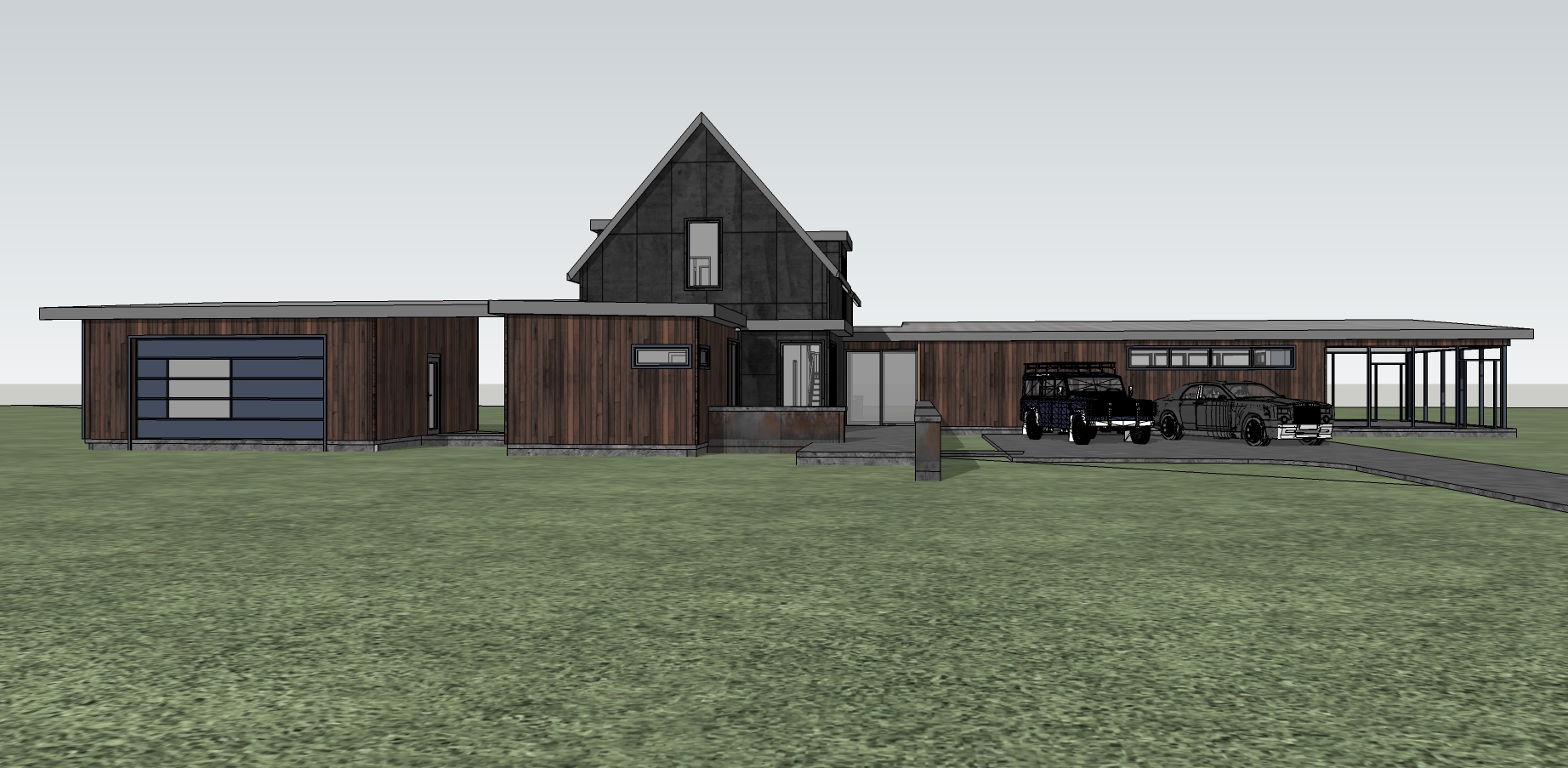 industrial design corten steel and concrete panels sunlight on building tall grass foreground and forest background