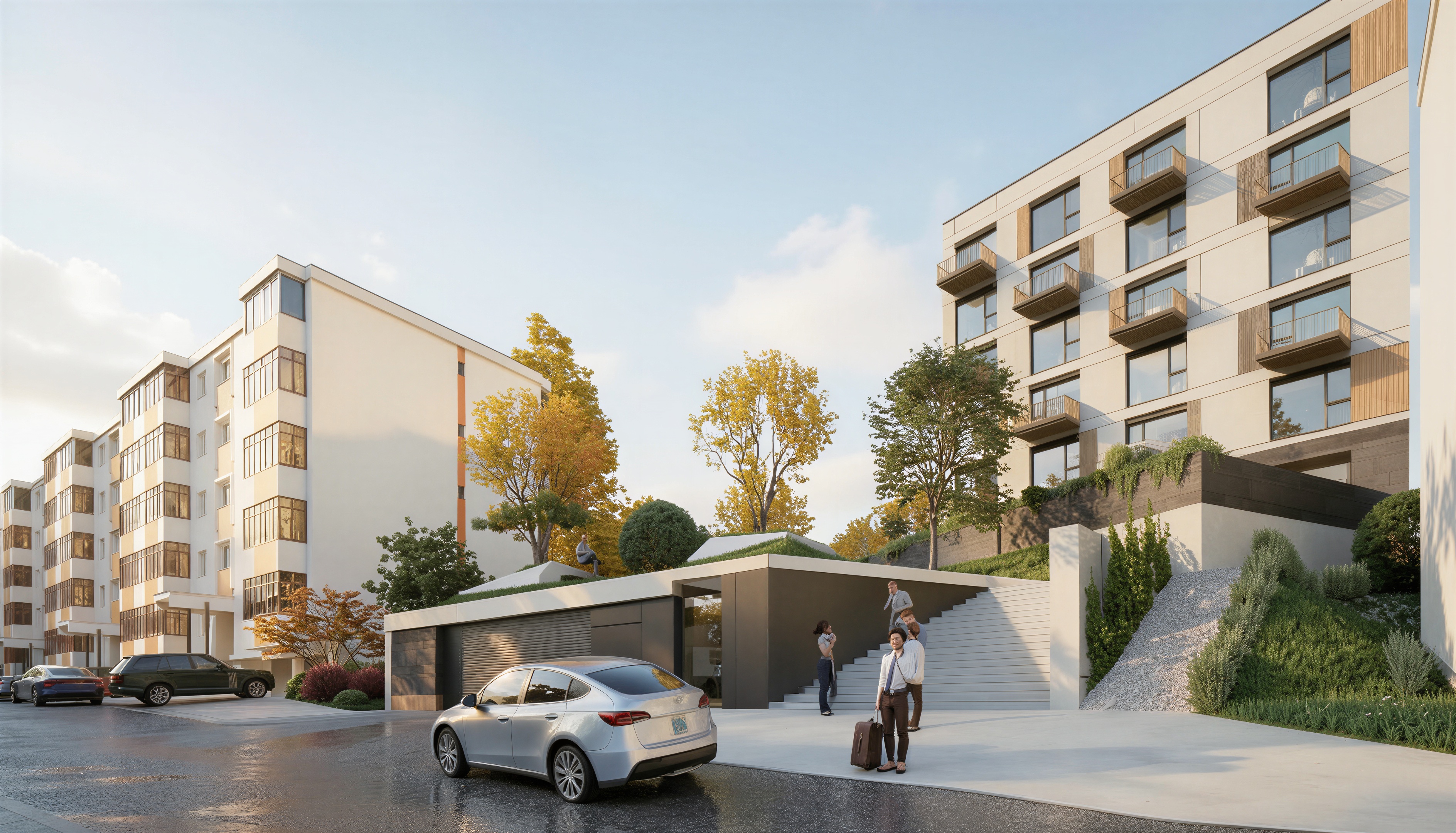 important preserve the existing geometry and the existing context exactly as provided do not modify alter reinterpret add remove scale or reshape any geometry do not change the site surroundings street layout neighboring buildings vegetation or context elements do not modify geometry scale proportions buildings road layout sidewalks or surrounding context in any way photorealistic architectural rendering clean and balanced contrast calm cinematic mood style contemporary european residential architecture minimalist premium understated delet all cars and people existing add people in motion subtle motion blur