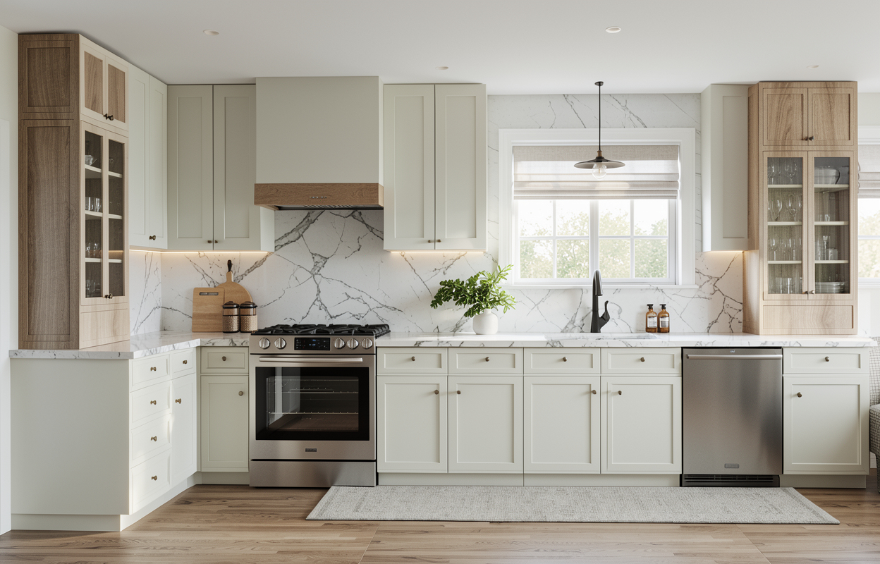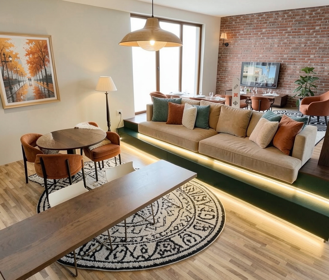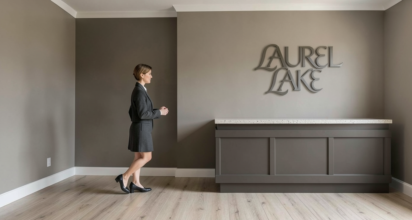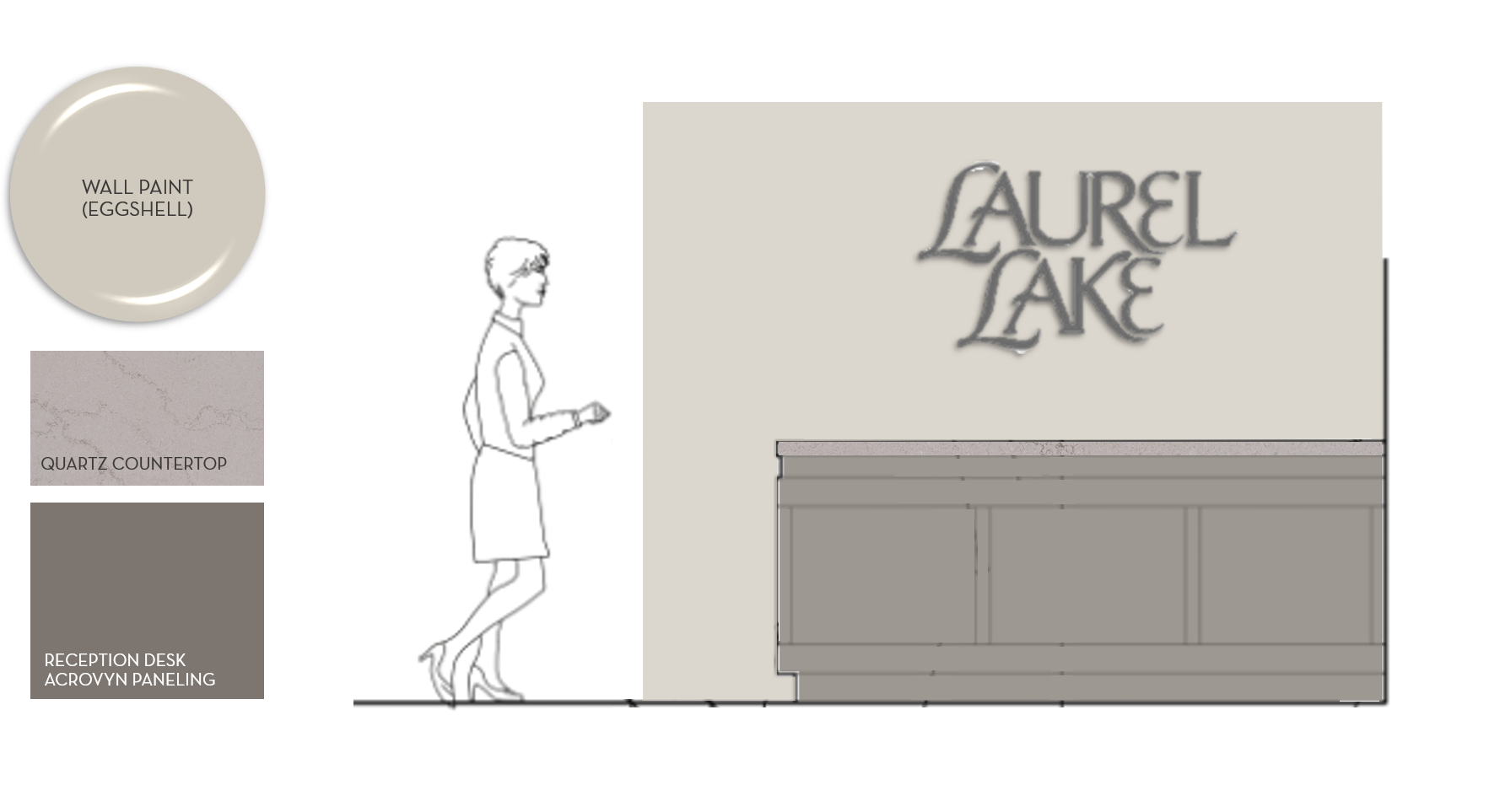 reception desk with dark taupe acrovyn paneling quartz countertop plain tan walls and light woodlook plank flooring nothing behind the woman in nurse outfit