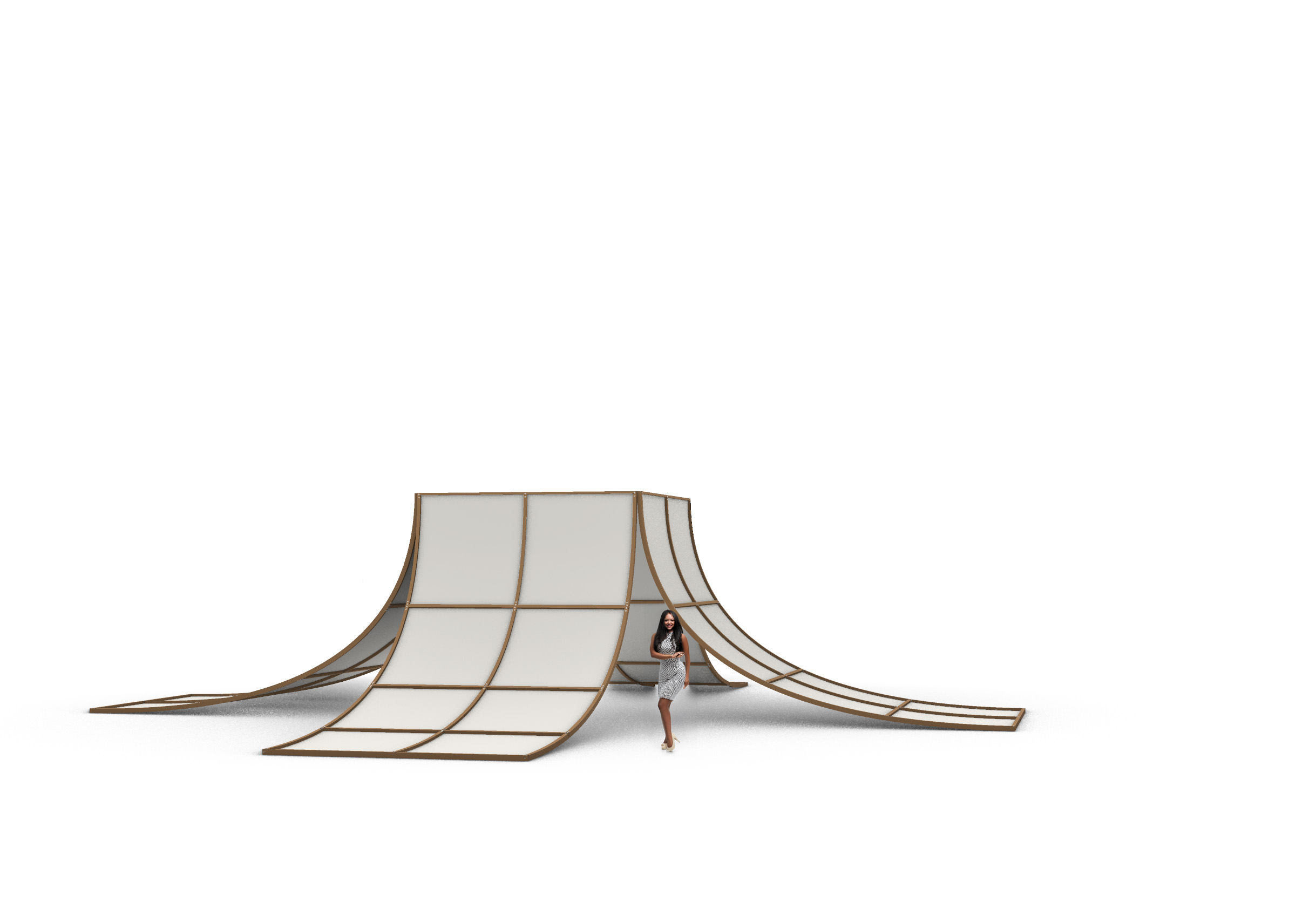 pavilion of timber and linen tranquil outdoor park settings minimalist add people standing underneath do not change the geometry of the pavilion