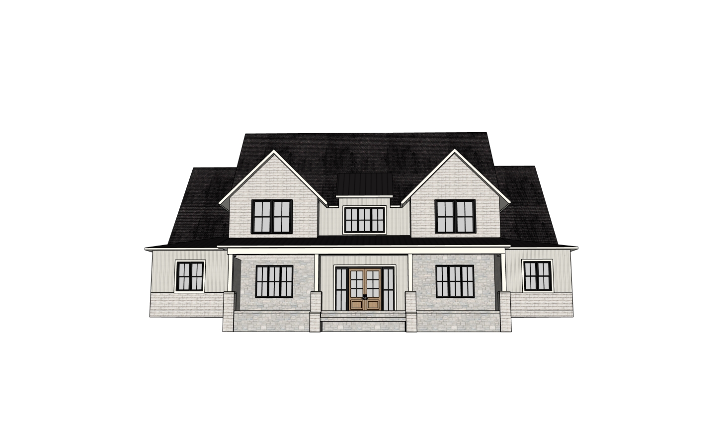house sits on a small hill lot in a subdivisions white brick under windows on left and right side brick above porch on left and right side siding in the middle and white stone on facade white stone on foundation and left and right under the porch sherwin williams drift of mist colored siding in the middle black metal roof on porches and shingles everywhere else black windows stained front door with black sidelights surrounded by native plants concrete driveway on right side