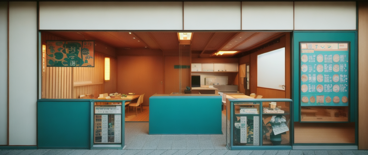 pop modern clean appealing appetising friendly bright no sunlight japanese style use red or orange wooden slabs concrete architecture