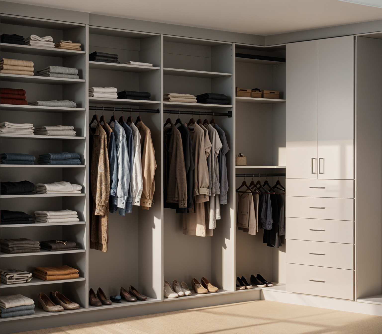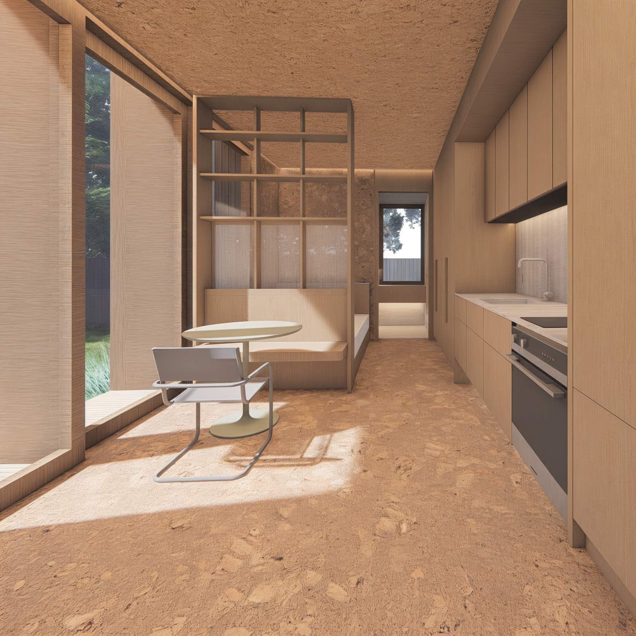 create a modern minimalist living and dining space with a warm inviting atmosphere use natural wood tones for the furniture and cabinetry emphasizing light oak shades the walls should have a textured earthy brown appearance to add depth and warmth incorporate a contemporary floor rug with abstract geometric patterns in muted greens soft pinks and off whites the flooring should seamlessly match the walls in a slightly darker cork texture ensure soft diffused lighting to enhance the cozy serene ambiance of the room