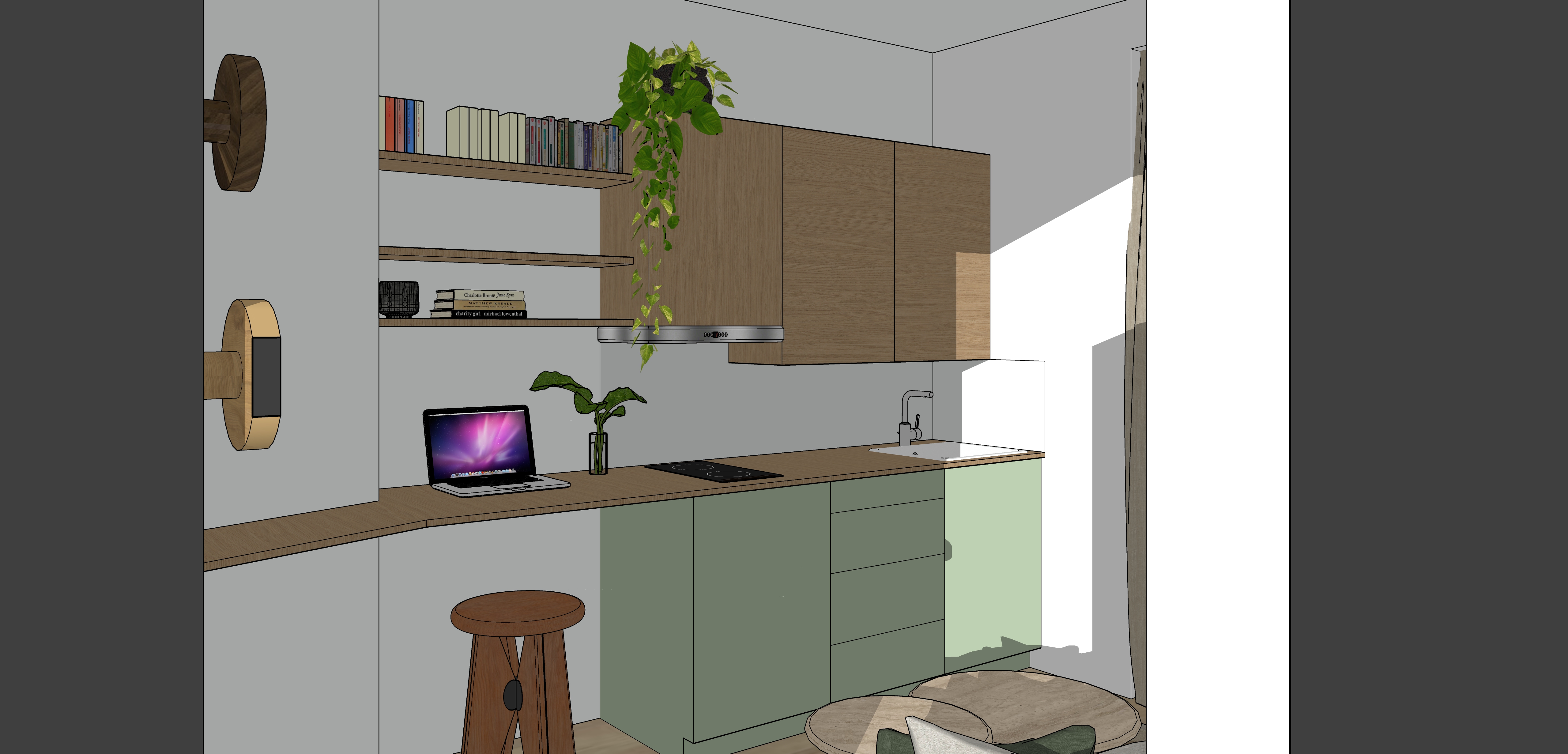 modern interior as in sketchup model minimalist design neutral colors natural materials clean lines large windows soft natural daylight add interior light high resolution ultra detailed sharp focus crisp edges photo realistic architectural visualization realistic lighting realistic shadows less contrast on materials