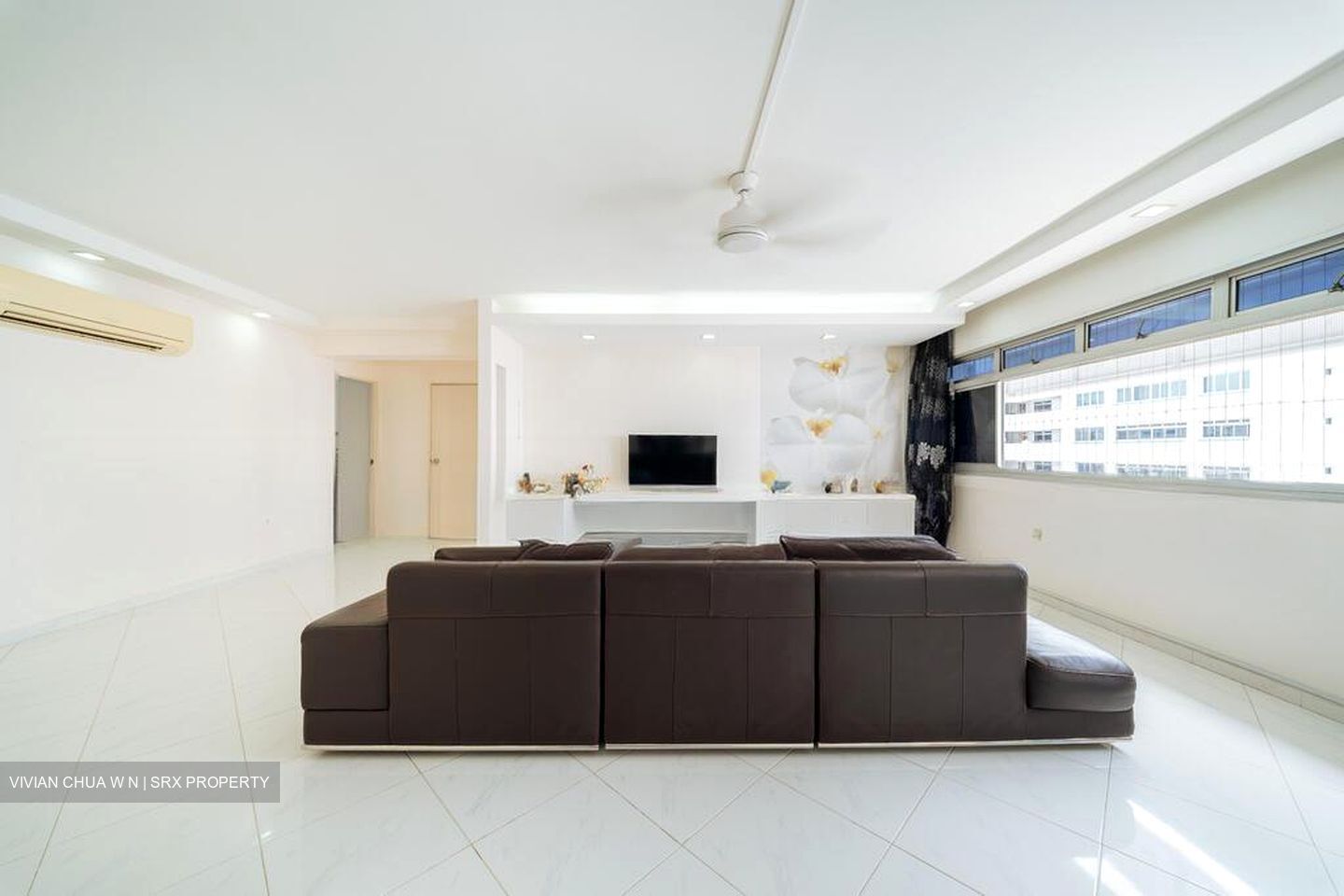 transform this living room into a modern style with nice ceiling lights and large formatt porcelain tiles