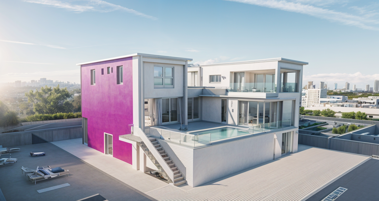 modern three story house contemporary design the cladding is white stucco and grey pebble dash accents with charcoal fascia on the upper balcony and roof with a white fascia on the lower balcony large glass balconies minimalistic architecture surrounding trees and shrubs in vibrant green pathway lined with lavender and ornamental grass warm and inviting atmosphere soft natural lighting illuminating the exterior clear blue sky architecture