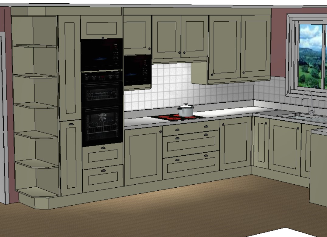 task convert the uploaded kitchen sketch into a photorealistic render absolute constraints do not violate the camera position perspective and field of view must remain identical to the sketch the kitchen layout cabinet positions sizes proportions and spacing must remain exactly the same as the sketch do not add remove move resize or invent any objects cabinets appliances windows doors or furniture keep cornice on top of wall units to fill up to the ceiling exactly as drawn if an item is not visible in the sketch it must not appear in the render treat the sketch as locked geometry only surface finishes may change allowed changes only these change the kitchen unit doors only to in frame shaker style doors each door to have a frame around door finish painted pocelin colour keep all cabinet divisions handles gaps and panel lines exactly as drawn handles are black knobs on doors and black cups on drawers exactly as drawn material finish specification worktop 30 mm thick marble effect laminate subtle veining panel behind hob from top of worktop to wall unit to be same material as the worktop upstands 100mm high on top of worktop around wall floor light oak timber flooring 150 mm wide planks laid left to right relative to the image walls milk chocolate brown colour ceiling white sink windows doors stools and all non cabinet elements must remain exactly as in the sketch lighting realism daytime natural light only sunlight entering through the existing windows casting realistic shadows consistent with the sketch no artificial mood lighting no dramatic lighting no added fixtures style photorealistic architectural visualization clean neutral realistic materials no artistic interpretation or redesign fail condition if the model cannot maintain exact geometry fidelity do not reinterpret the design prioritize matching the sketch over realism style photorealistic architectural visualization clean neutral realistic materials no artistic interpretation or redesign fail condition if the model cannot maintain exact geometry fidelity do not reinterpret the design prioritize matching the sketch over realism