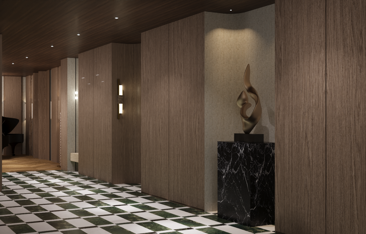 improve materials texture make it realistic keep colors tones and patterns the same make the image photorealistic high resolution keep all elements and colors the same keep image environment at night time don t make environment too dark keep same lighting keep same camera distance avoid zoom in keep same camera angle calm ambient luxury feel no glare around wall lights maintain curves on walls