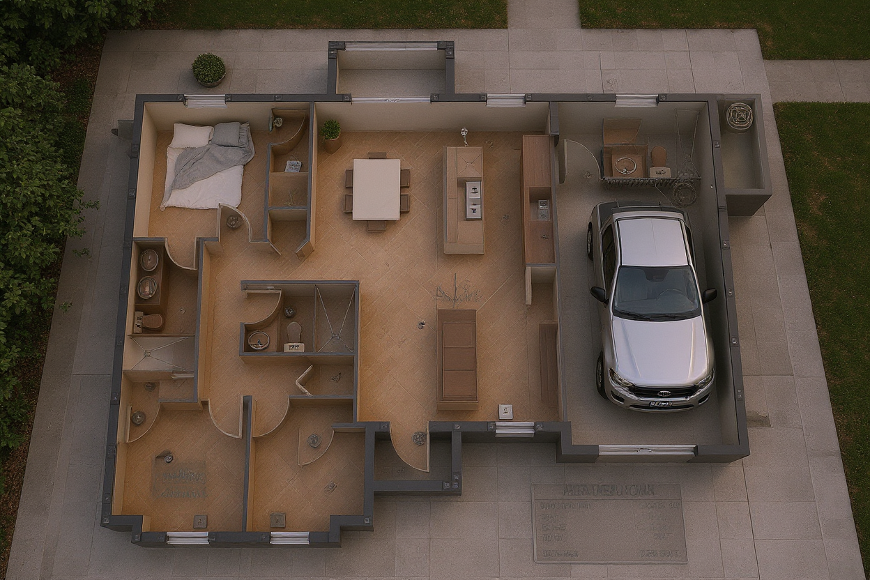 convert this image into a realistic drone style aerial photograph of a finished ranch farm post frame home set in rural alberta canada show wide open farmland fields gravel driveways and prairie landscape the building should appear as a modern post frame ranch with metal roofing and siding surrounded by open fields and light tree lines in the distance use natural daylight realistic shadows and true to life textures make it look like an authentic real estate drone photo taken from 150 250 feet in the air