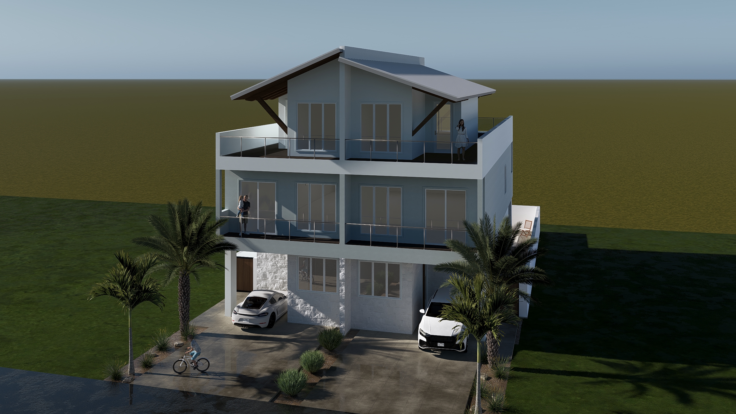place the house in a coastal neighborhood surrounded by beach houses dont add any bay or beach areas keep all colors and finishes the same as the uploaded image