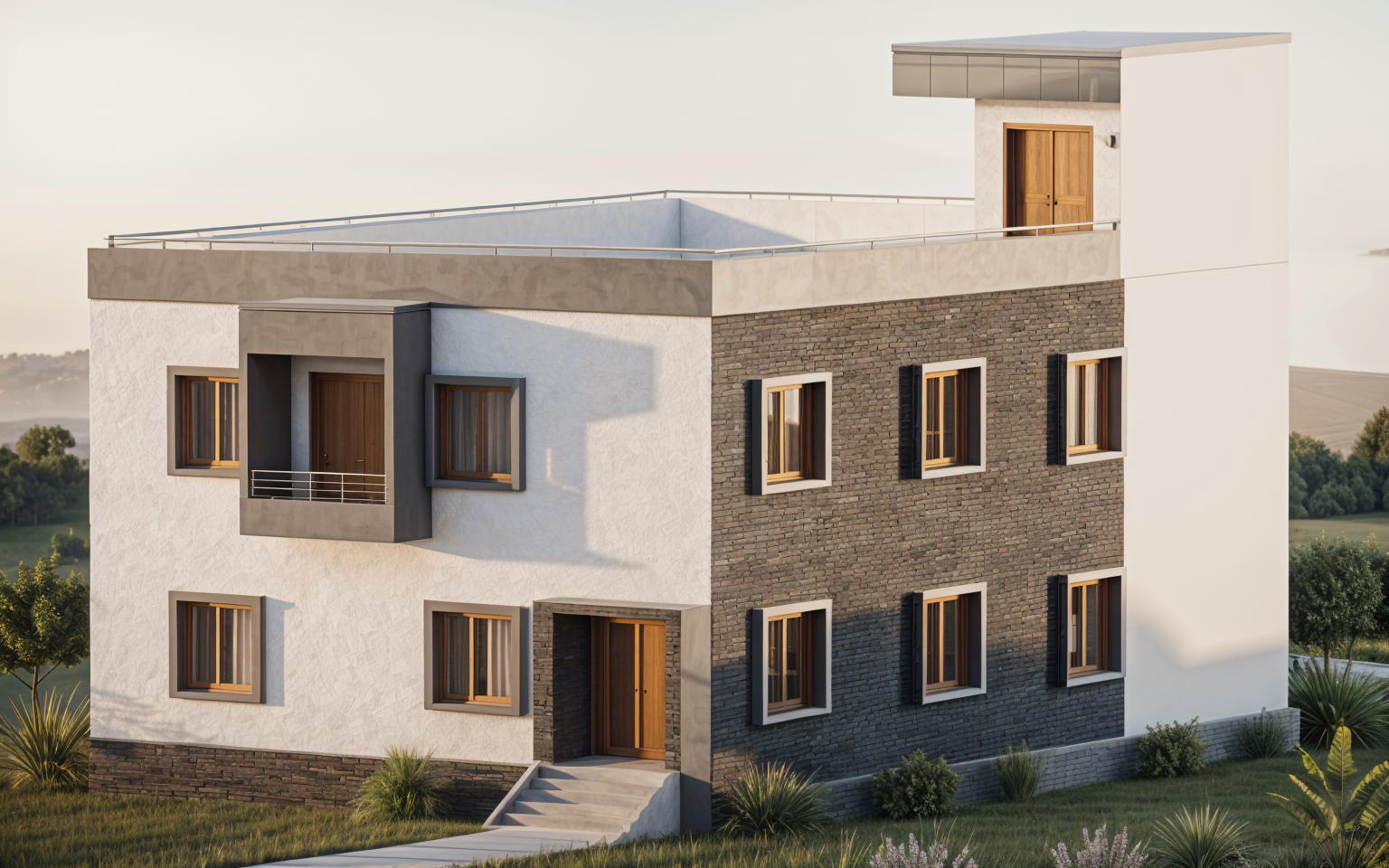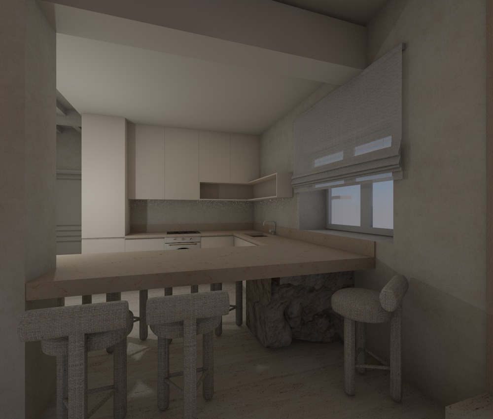 create a highly realistic render of a modern kitchen with a calm warm and refined atmosphere the design is minimal and cohesive with a soft neutral palette and natural materials that create an elegant and high end feel the kitchen layout is linear with an l shaped extension featuring clean handle less cabinetry in a light beige tone with a matte finish the surfaces appear smooth and seamless the countertop and backsplash are in a natural light beige stone with subtle texture and a soft matte appearance enhancing the organic aesthetic a hidden led strip is installed beneath the upper cabinets providing soft indirect lighting that gently illuminates the backsplash and countertop creating a warm and ambient glow in the foreground there is an extended kitchen island or bar with a solid monolithic appearance in the same light beige stone material in front of the island there are bar stools with light oak wooden legs and a natural finish the seats are upholstered in a soft light beige linen fabric with a subtle texture that enhances the natural and refined look at the back a window allows soft natural light to enter the space diffused by a light fabric roman shade in a neutral tone the walls are finished in a light beige microcement creating a seamless and soft background the flooring is in a light natural tone maintaining the calm and cohesive aesthetic the overall lighting is soft and balanced combining natural light with the hidden led lighting creating minimal shadows and a warm inviting and high end atmosphere ultra realistic render high resolution premium materials interior design magazine photography style off white raw marblr on the right