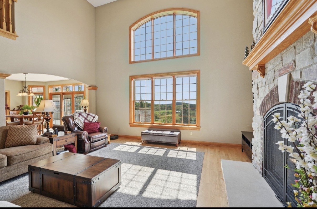 change the wall color to creamy white take out the carpet and replace with cream colored area rug replace all flooring with extra wide plank european white oak floors change the fireplace wall to look like reference image black windows