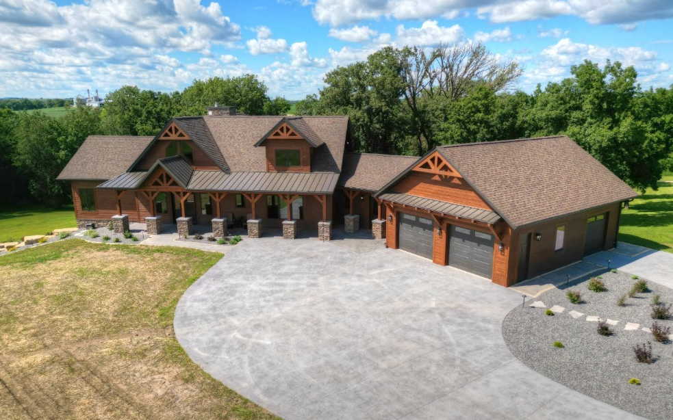 vertical barnwood siding in colorado mountains near river in front add aspen trees wood garage doors black metal roof black windows add driveway to garage