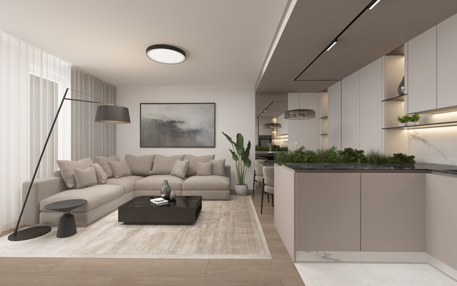 luxurious modern living room with a neutral color palette a large cozy grey beige sectional sofa with plush cushions is the focal point a sleek black marble coffee table sits in front of it accompanied by a minimalist black floor lamp the walls are adorned with abstract art in gray tones soft natural light filters through sheer white curtains casting gentle shadows the kitchen area features elegant beige cabinetry with soft ambient lighting lush green plants add a touch of nature creating a peaceful atmosphere the room exudes warmth and sophistication with its harmonious blend of soft beiges subtle grays and rich blacks