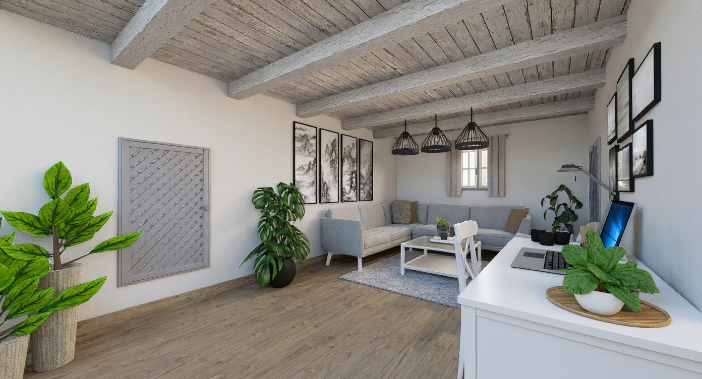 render a modern minimalist open concept living and dining space use soft neutral tones for the walls such as creamy beige the ceiling should be a modern slate gray incorporate a sleek dark gray countertop for the kitchen island accented with a matte black faucet design the floor with large smooth dark gray tiles adorn the space with a contemporary light gray sofa the dining table should be a rich walnut wood surrounded by matching chairs with cushioned beige seats include minimalist white pendant lights over the dining area large windows should let in natural light with sheer white curtains softly diffusing it create a calm inviting atmosphere with a touch of elegance and warmth