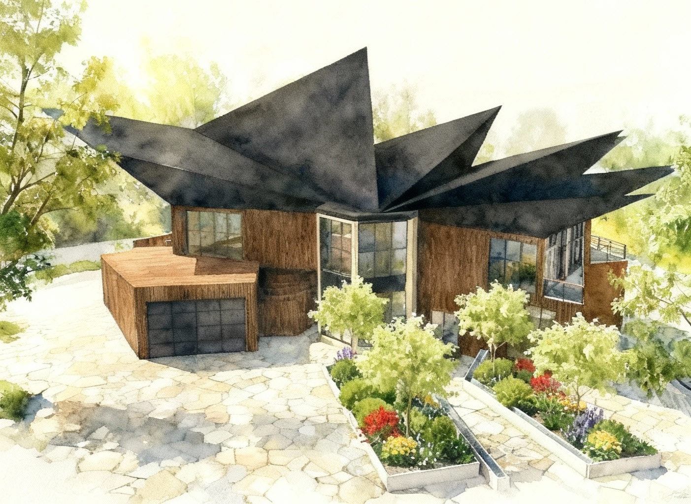 render the building in this image with soft textures the roof is a black standing seam roof the walls are light wood like a cabin off a cliff architectural watercolor rendering of a small contemporary research station perched off a rocky cliff precise and realistic architectural detailing cantilevered over stone terrain surrounded by mountain pines and mist below rendered with crisp building geometry and realistic materials background and edges dissolve into loose watercolor washes and white paper edges not full bleed with soft unfinished fade around the image visible pencil and ink linework with light technical annotations artistic yet grounded balance of precision and painterly abstraction calm morning light concept architectural visualization style