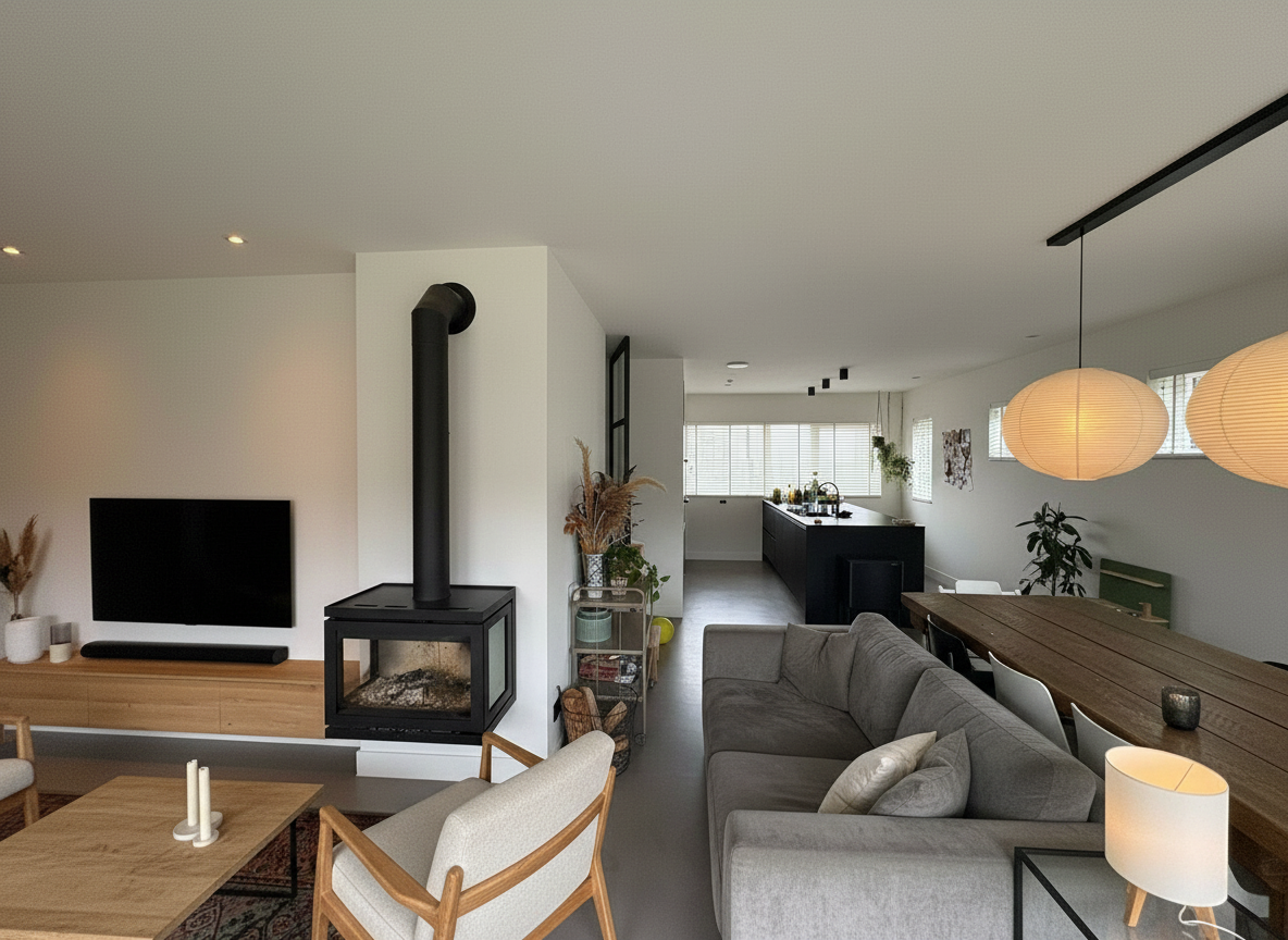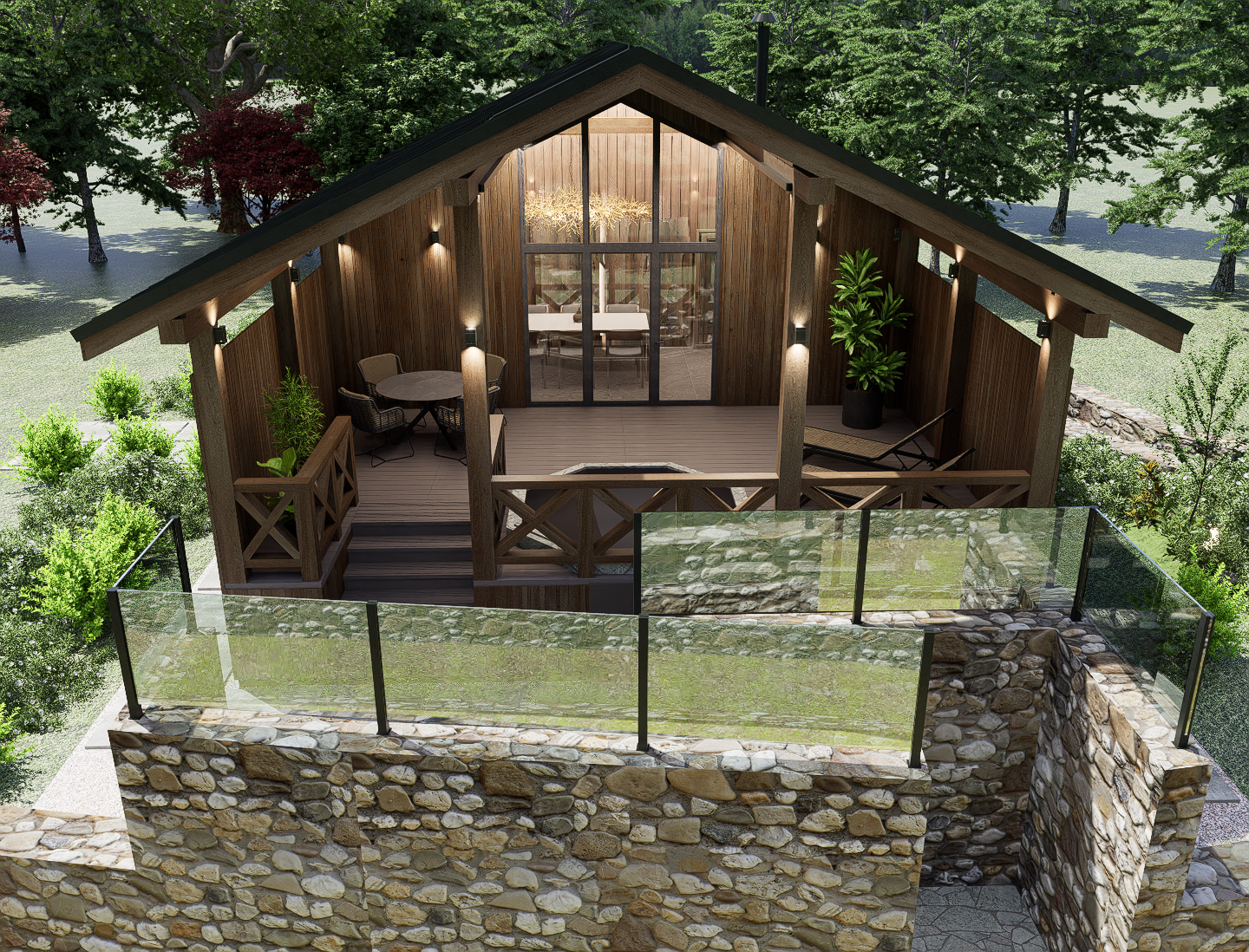 create a photorealistic 3d perspective of this house using the current material style but enhancing it use a graphite metal roof with a standing seam and vertical wood siding keep the model s geometry intact windows doors roof walls sidewalk and driveway create lush vegetation that looks natural to lumshori don t change the look simply enhance the existing materials and enhance the landscape detailed vegetation textures in the wood siding and reflections in the glass as well as a bright clear sky with subtle atmospheric depth render in hyperrealistic architectural visualization quality resolution hd