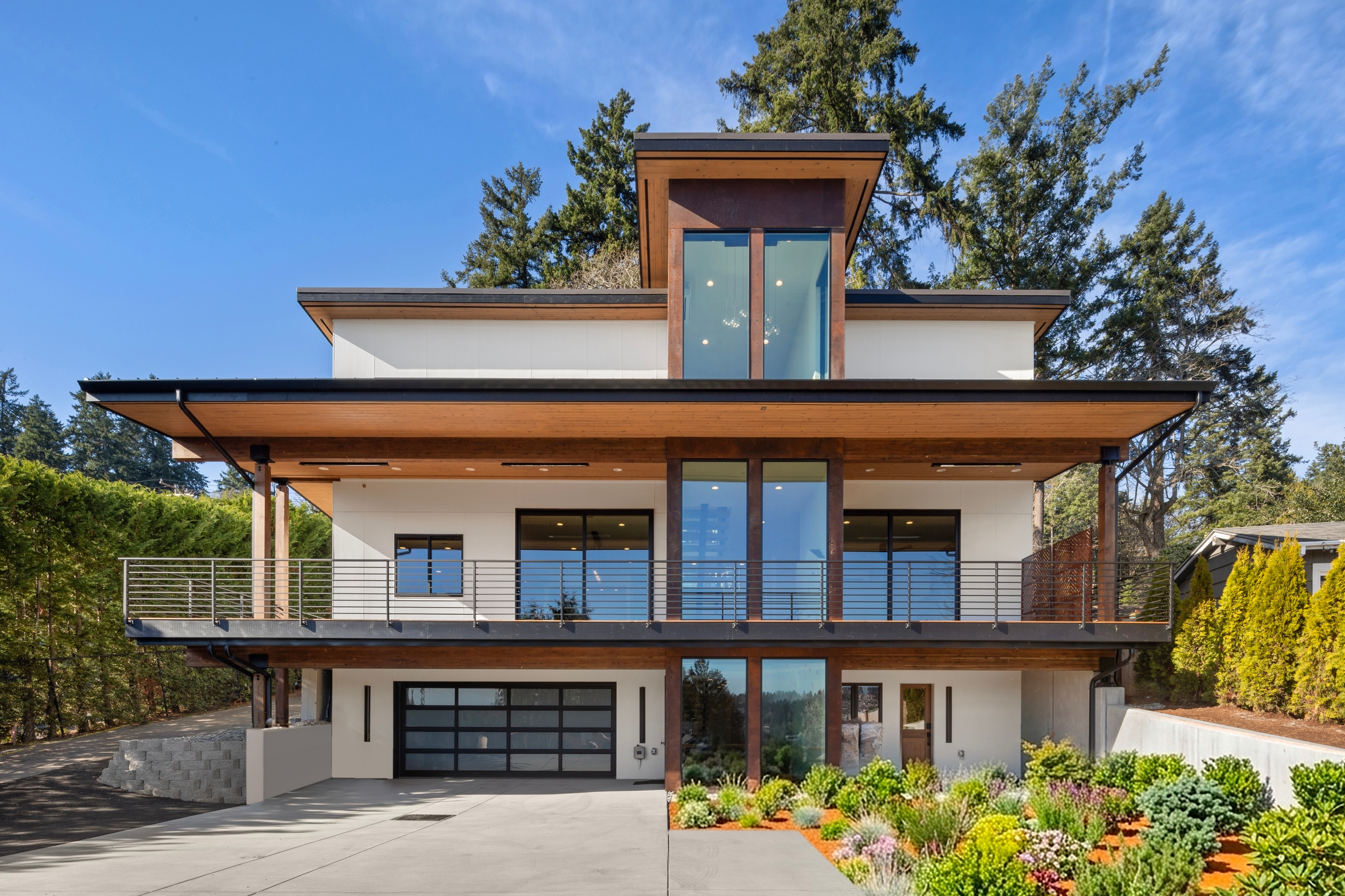 change the landscaping in the right lower part of the photo to a more organic and natural pacific northwest style it should be a mix of some plants rocks and paths including a mix of bark and rock ground cover