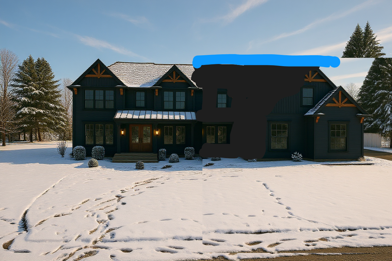 exterior shot i need this to not look like a copy and cut style but more realistic the black painted areas will lbe the same dark blue siding as the rest then just a roof line that is even on top