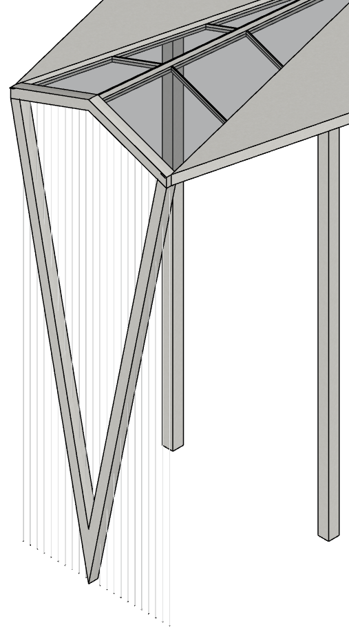 render this exact structural module without altering its geometry scale proportions camera angle or composition maintain the crisp isometric view and minimal white background concrete v column framing stays identical glass roof planes remain unchanged cable layout stays vertical and aligned as modeled refinement detailing required add a precise square concrete footing pad under the v column small minimal flush to ground with four subtle recessed bolt heads add tiny ground cable anchoring points thin stainless steel termination dots or flush discs where each cable meets the ground they should be delicate engineered and minimally expressive maintain ultra thin stainless cables evenly spaced with very small connection clamps along the v frame highlight reflections on glass subtly no exaggeration keep the concrete texture smooth lightly speckled and consistent with existing tone shadows should extend cleanly behind and slightly right long and architectural rendering style high resolution architectural visualization light touch precision engineering aesthetic soft sunlight no haze no modifications to the physical form only articulation and detailing tone intent should read like a structural detail vignette demonstrating cable attachment logic and elegant footing support refined minimal and believable
