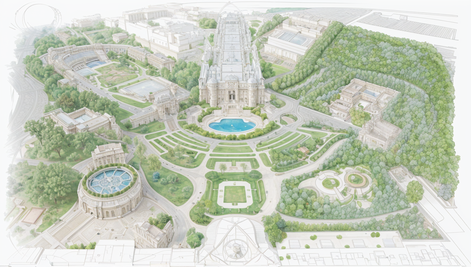 redraw as a clean architectural line drawing pure black strokes on white no gray pixels keep only key masses and paths central building main terraces paths ponds primary axes a few major adjacent blocks remove shading pencil tone paper texture foliage micro details people noise vignette continuous black ink outlines with line hierarchy thicker primary thinner secondary flat white background no hatching no cross hatching no stippling no gradients