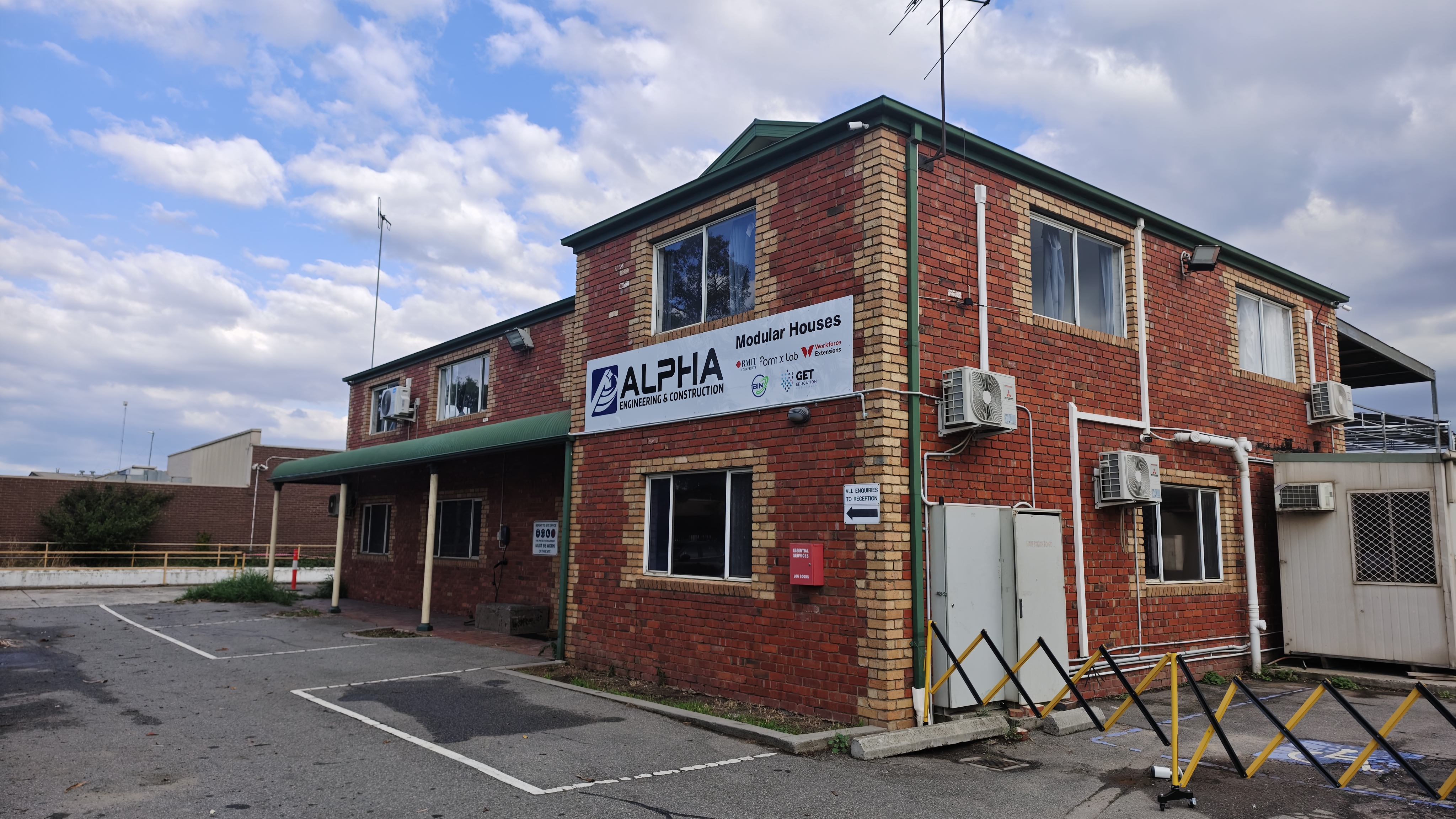 a two storey white brick factory front facade