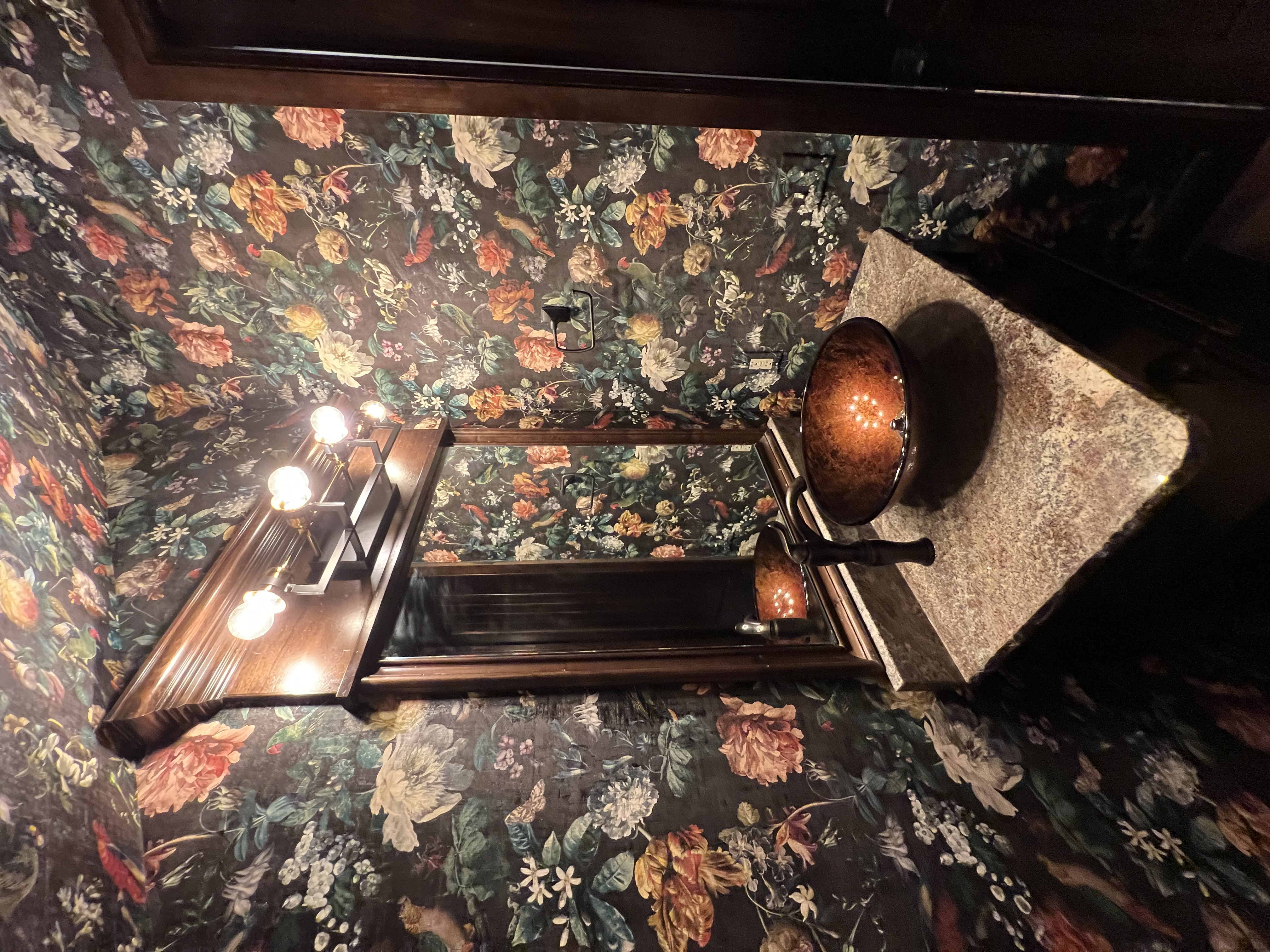 change mirror to a gold mirror with an alabaster vanity sconce above