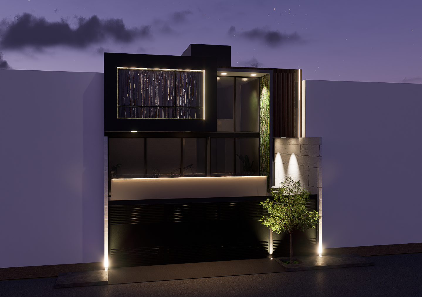 ultra photorealistic modern house facade 3 story contemporary architecture frontal view full facade composition as main focus clean volumes in black dark gray and off white vertical wooden slats large floor to ceiling glass windows warm integrated led lighting in facade lines and soffits realistic materials matte stucco natural wood clear glass metal details wet pavement with subtle reflections blue hour lighting twilight cinematic but natural sheer white linen curtains semi transparent soft folds low opacity matte fabric subtle presence not dominant not glossy not metallic eye level shot 35mm lens architectural photography slight perspective correction global illumination realistic shadows soft warm interior light cool exterior ambient light