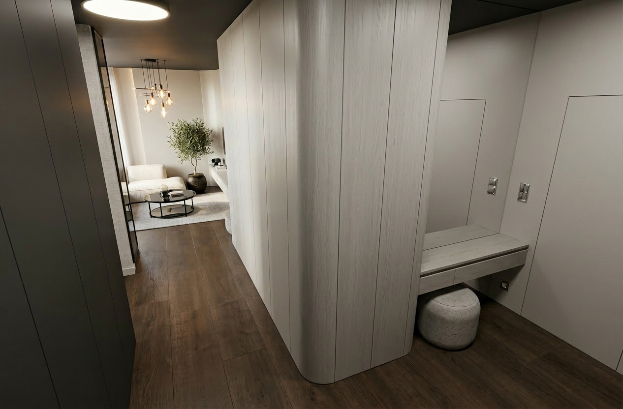 create a photorealistic image of a modern one floor house with contemporary architecture the building has a flat roof large floor to ceiling windows and partially uses light colored wooden cladding on the facade the design is clean and minimalist in front of the house there is a green lawn withwhite and beige flowers and landscaping the entrance is fully accessible for wheelchair users with a smooth ramp integrated into the design natural daylight realistic materials high detail architectural visualization style