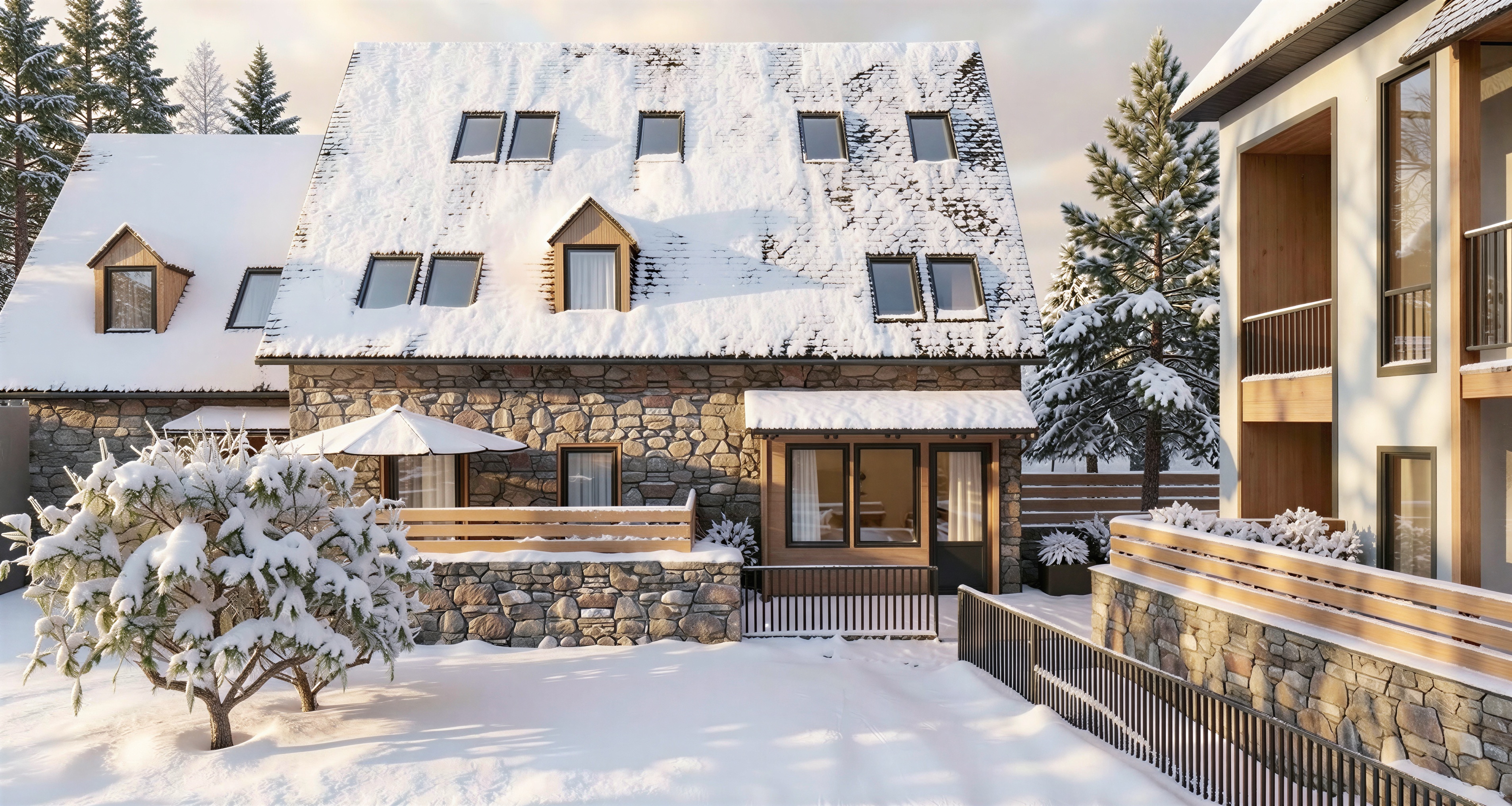 no modifiques nada del render sustituye los arboles que hay en primer plano por unos pinos de distintos tama o mediano nevados